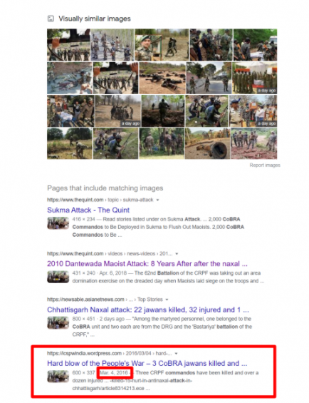 ਨਕਸਲੀ ਹਮਲੇ ਵਿਚ ਜਖਮੀ ਅਤੇ ਸ਼ਹੀਦ ਹੋਏ ਸੈਨਿਕਾਂ ਦੀ ਤਸਵੀਰ ਦੀ ਪੜਤਾਲ ਕਰਨ ਲਈ ਅਸੀਂ ਸਭ ਤੋਂ ਪਹਿਲਾਂ ਗੂਗਲ ਰਿਵਰਸ ਇਮੇਜ ਸਰਚ ਦੀ ਮਦਦ ਨਾਲ ਵਾਇਰਲ ਤਸਵੀਰ ਨੂੰ ਖੰਗਾਲਿਆ। ਸਰਚ ਦੌਰਾਨ ਅਸੀਂ ਪਾਇਆ ਕਿ ਵਾਇਰਲ ਤਸਵੀਰ 2016 ਤੋਂ ਇੰਟਰਨੈਟ ਤੇ ਮੌਜੂਦ ਹੈ ਅਤੇ ਛੱਤੀਸਗੜ੍ਹ ਦੇ ਬਸਤਰ ਵਿਚ ਹੋਏ ਨਕਸਲੀ ਹਮਲੇ ਵਿਚ 23 ਸੈਨਿਕਾਂ ਦੀ ਸ਼ਹਾਦਤ ਨਾਲ ਇਸ ਤਸਵੀਰ ਦਾ ਸੰਬੰਧ ਨਹੀਂ ਹੈ।
