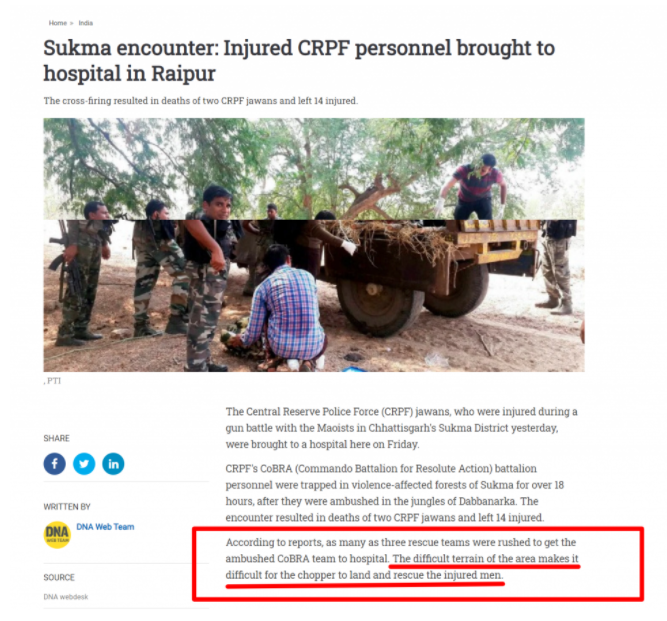 ਅਸੀਂ ਕੁਝ ਹੋਰ ਕੀਵਰਡਸ ਦੀ ਸਹਾਇਤਾ ਨਾਲ ਗੂਗਲ ਤੇ ਖੋਜ ਕਰਨ ‘ਤੇ, ਸਾਨੂੰ ਮੀਡਿਆ ਏਜੇਂਸੀ ਡੀਐਨਏ ਦੁਆਰਾ 5 ਮਾਰਚ 2016 ਨੂੰ ਪ੍ਰਕਾਸ਼ਤ ਲੇਖ ਮਿਲਿਆ ਜਿਸ ਵਿਚ ਦੱਸਿਆ ਗਿਆ ਹੈ ਕਿ ਵਾਇਰਲ ਤਸਵੀਰ ਸਾਲ 2016 ਵਿਚ ਛੱਤੀਸਗੜ੍ਹ ਦੇ ਸੁਕਮਾ ਵਿਚ ਹੋਏ ਨਕਸਲੀ ਹਮਲੇ ਨਾਲ ਸਬੰਧਤ ਹੈ ਜਿਸ ਵਿਚ ਕਈ ਸੈਨਿਕ ਜ਼ਖਮੀ ਹੋ ਗਏ ਸਨ।