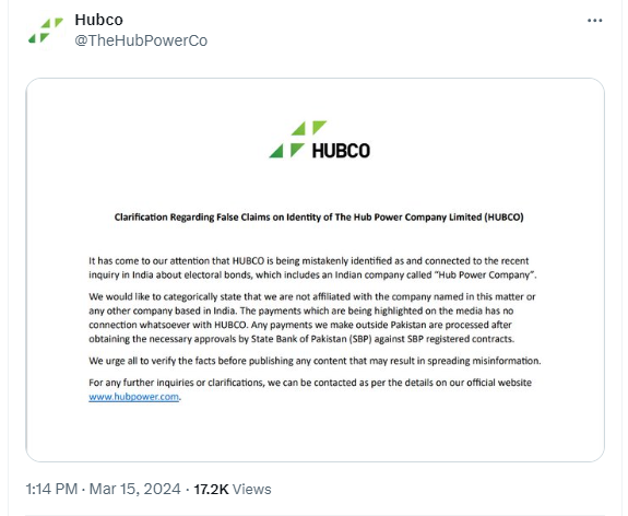 ਜਾਂਚ ਦੌਰਾਨ, ਸਾਨੂੰ 15 ਮਾਰਚ, 2024 ਨੂੰ HUBCO ਦੇ ਅਧਿਕਾਰਤ X ਖਾਤੇ ਦੁਆਰਾ ਟਵੀਟ ਕੀਤਾ ਗਿਆ ਇੱਕ ਸਪਸ਼ਟੀਕਰਨ ਵੀ ਮਿਲਿਆ। ਜਾਰੀ ਕੀਤੇ ਗਏ ਸਪਸ਼ਟੀਕਰਨ ਵਿੱਚ, ਹੱਬਕੋ ਨੇ ਲਿਖਿਆ, “ਸਾਡੇ ਧਿਆਨ ਵਿੱਚ ਆਇਆ ਹੈ ਕਿ ਹੱਬਕੋ ਨੂੰ ਭਾਰਤ ਵਿੱਚ ਚੋਣ ਬਾਂਡਾਂ ਬਾਰੇ ਲਿੰਕ ਕੀਤਾ ਜਾ ਰਿਹਾ ਹੈ, ਜਿਸ ਵਿੱਚ “ਹੱਬ ਪਾਵਰ ਕੰਪਨੀ” ਨਾਮ ਦੀ ਇੱਕ ਭਾਰਤੀ ਕੰਪਨੀ ਵੀ ਸ਼ਾਮਲ ਹੈ। ਅਸੀਂ ਸਪੱਸ਼ਟ ਤੌਰ ‘ਤੇ ਦੱਸਣਾ ਚਾਹੁੰਦੇ ਹਾਂ ਕਿ ਸਾਡਾ ਇਸ ਮਾਮਲੇ ਵਿੱਚ ਕੋਈ ਸਬੰਧ ਨਹੀਂ ਹੈ। ਅਸੀਂ ਪਾਕਿਸਤਾਨ ਤੋਂ ਬਾਹਰ ਜੋ ਵੀ ਭੁਗਤਾਨ ਕਰਦੇ ਹਾਂ, ਉਹ ਸਟੇਟ ਬੈਂਕ ਆਫ਼ ਪਾਕਿਸਤਾਨ (SBP) ਦੀ ਮਨਜ਼ੂਰੀ ਤੋਂ ਬਾਅਦ ਹੀ ਕੀਤਾ ਜਾਂਦਾ ਹੈ।