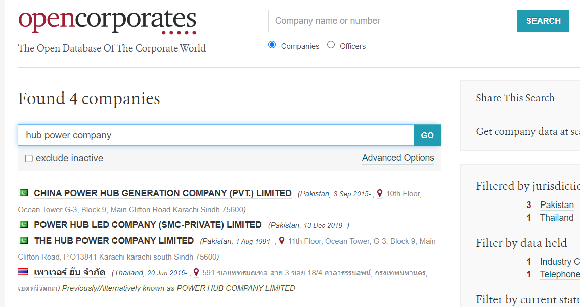 ਹੁਣ ਅਸੀਂ ਸੂਚੀ ਵਿੱਚ ਮੌਜੂਦ ਭਾਰਤੀ ਹੱਬ ਪਾਵਰ ਕੰਪਨੀ ਦੀ ਜਾਂਚ ਕੀਤੀ। ਅਸੀਂ ਇਸ ਕੰਪਨੀ ਦੇ ਵੇਰਵਿਆਂ ਨੂੰ opencorporates.com ‘ਤੇ ਖੋਜਿਆ, ਇਸ ਵੈਬਸਾਈਟ ਵਿੱਚ ਵਿਸ਼ਵ ਪੱਧਰ ਦੇ ਕਾਰਪੋਰੇਟ ਕੰਪਨੀਆਂ ਦੇ ਵੇਰਵੇ ਸ਼ਾਮਲ ਹਨ ਪਰ ਅਸੀਂ ਭਾਰਤ ਵਿੱਚ ਰਜਿਸਟਰਡ ਇਸ ਨਾਮ ਜਾਂ ਸਮਾਨ ਨਾਮ ਵਾਲੀ ਕੋਈ ਕੰਪਨੀ ਨਹੀਂ ਲੱਭ ਸਕੇ।