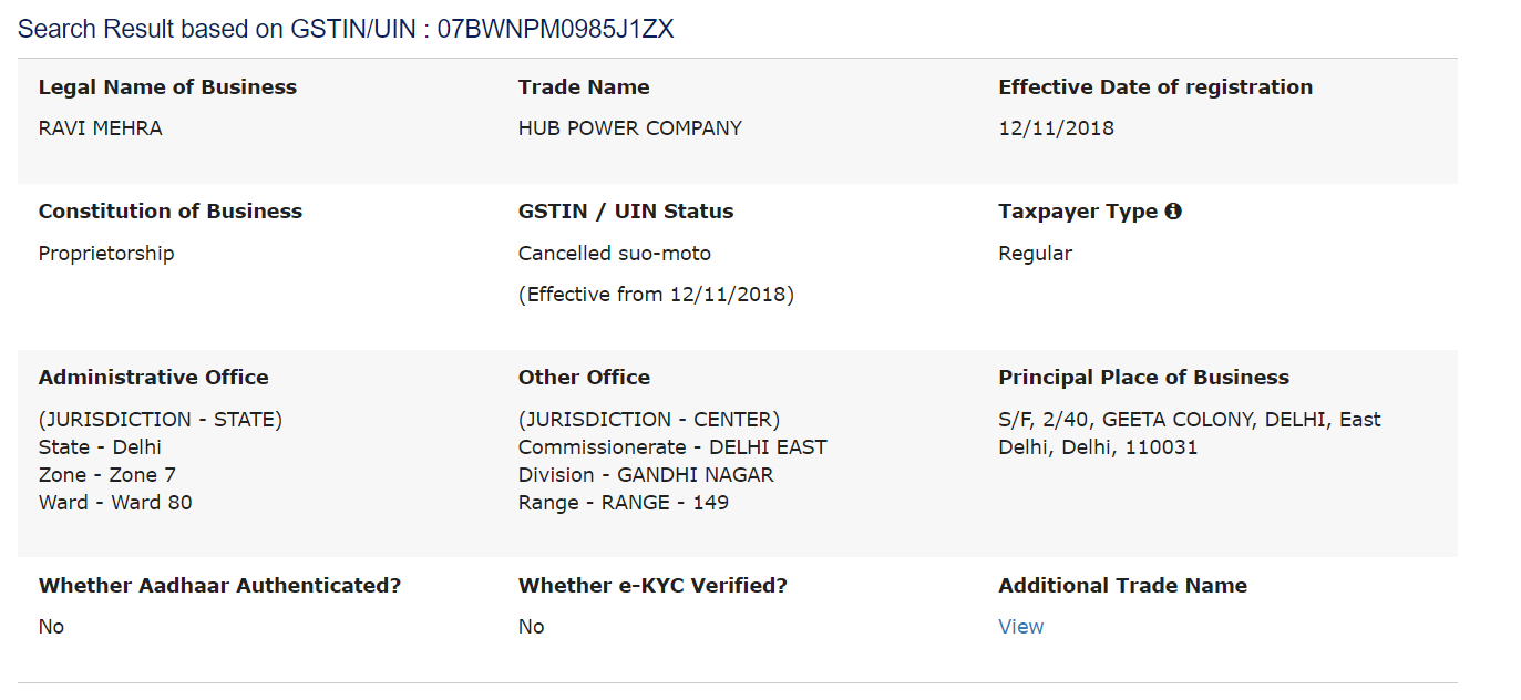 ਅਸੀਂ GST ਦੀ ਅਧਿਕਾਰਤ ਵੈੱਬਸਾਈਟ ‘ ਤੇ ਜਾਂਚ ਦੌਰਾਨ ਮਿਲੇ GST ਨੰਬਰ ਦੀ ਖੋਜ ਕੀਤੀ। ਅਸੀਂ ਦੇਖਿਆ ਕਿ ਇਹ ਕੰਪਨੀ ਰਵੀ ਮਹਿਰਾ ਦੇ ਨਾਂ ‘ਤੇ ਰਜਿਸਟਰਡ ਹੈ। ਅਸੀਂ ਇਹ ਵੀ ਦੇਖਿਆ ਕਿ ਇਸ ਕੰਪਨੀ ਦਾ ਕਾਰੋਬਾਰ ਦਾ ਐਡਰੈਸ ਗੀਤਾ ਕਲੋਨੀ ਬਲਾਕ ਨੰਬਰ 2 ਦੀ ਬਿਲਡਿੰਗ ਨੰਬਰ 40 ਦੀ ਦੂਜੀ ਮੰਜ਼ਿਲ ‘ਤੇ ਹੈ। ਇਹ ਵੀ ਦੱਸਿਆ ਗਿਆ ਹੈ ਕਿ ਇਸ ਕੰਪਨੀ ਦੀ ਜੀਐਸਟੀ ਰਜਿਸਟ੍ਰੇਸ਼ਨ 12 ਨਵੰਬਰ 2018 ਨੂੰ ਕੀਤੀ ਗਈ ਸੀ, ਪਰ ਬਾਅਦ ਵਿੱਚ ਇਸ ਨੂੰ ਖੁਦ ਹੀ ਰੱਦ ਕਰ ਦਿੱਤਾ ਗਿਆ ਸੀ।