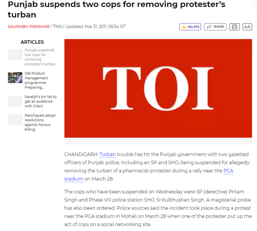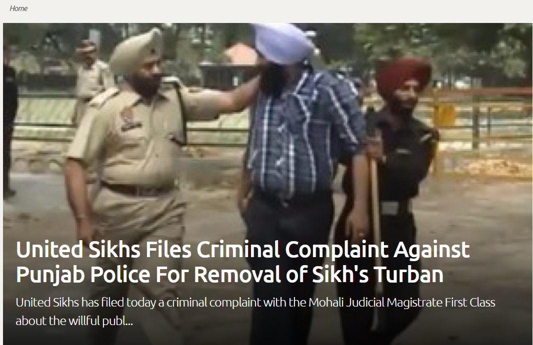 ਲੇਖ ਦੇ ਮੁਤਾਬਕ , ਗੈਰ ਮੁਨਾਫਾ ਸੰਗਠਨ ਯੂਨਾਈਟਿਡ ਸਿੱਖ ਨੇ ਇੱਕ ਸਿੱਖ ਨੌਜਵਾਨ ਦੀ ਦਸਤਾਰ ਉਤਾਰਨ ਦੇ ਵਿਰੋਧ ਵਿੱਚ ਪੰਜਾਬ ਪੁਲਿਸ ਦੇ ਖਿਲਾਫ ਮੁਹਾਲੀ ਜੁਡੀਸ਼ੀਅਲ ਮੈਜਿਸਟਰੇਟ ਅੱਗੇ ਅਪਰਾਧਿਕ ਸ਼ਿਕਾਇਤ ਦਰਜ ਕਰਵਾਈ ਹੈ। ਉਨ੍ਹਾਂ ਨੇ ਹੋਰਾਂ ਸਮੇਤ ਤਤਕਾਲੀ ਪ੍ਰਧਾਨ ਮੰਤਰੀ, ਸੀਜੇਆਈ, ਐਨਐਚਆਰਸੀ ਨੂੰ ਵੀ ਇਸ ਮਾਮਲੇ ਵਿੱਚ ਪੱਤਰ ਲਿਖੇ ਸਨ।