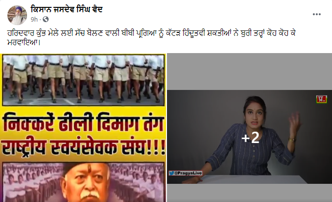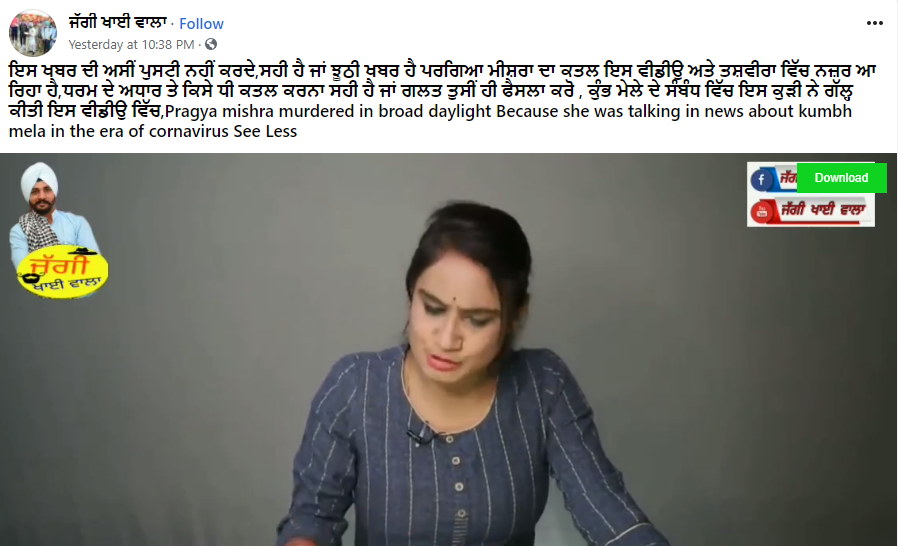 ਫੇਸਬੁੱਕ ਯੂਜ਼ਰ ਲਖਵਿੰਦਰ ਸਿੰਘ ਨੇ ਇਸ ਵੀਡੀਓ ਨੂੰ ਅਪਲੋਡ ਕਰਦੇ ਹੋਏ ਲਿਖਿਆ,”ਪ੍ਰੱਗਿਆ ਮਿਸ਼ਰਾ ਨੇ ਸੱਚ ਬੋਲਿਆ ਤਾਂ ਮੌਤ ਮਿਲੀ ਇਨਾਮ ਵਿਚ।”