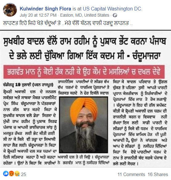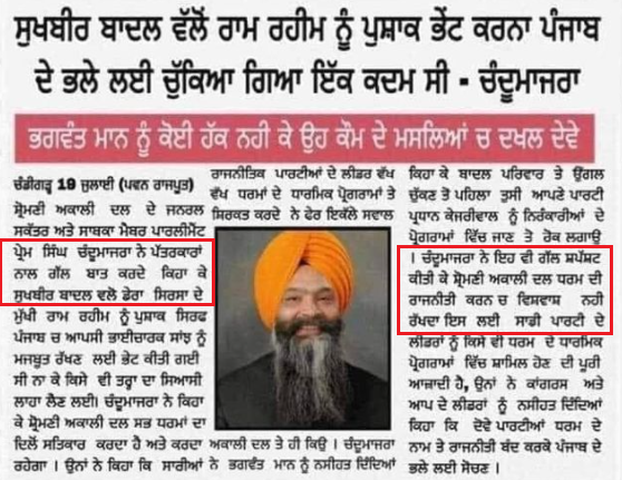 ਸੋਸ਼ਲ ਮੀਡੀਆ ਤੇ ਇੱਕ ਨਿਊਜ਼ਪੇਪਰ ਦੀ ਕਲਿਪਿੰਗ ਵਾਇਰਲ ਹੋ ਰਹੀ ਹੈ ਜਿਸ ਦੇ ਵਿਚ ਸ਼੍ਰੋਮਣੀ ਅਕਾਲੀ ਦਲ ਦੇ ਸਾਬਕਾ ਸੰਸਦ ਮੈਂਬਰ ਪ੍ਰੇਮ ਸਿੰਘ ਚੰਦੂਮਾਜਰਾ ਦਾ ਬਿਆਨ ਲਗਾਇਆ ਗਿਆ ਹੈ। ਬਿਆਨ ਦੇ ਮੁਤਾਬਿਕ , ਪ੍ਰੇਮ ਸਿੰਘ ਚੰਦੂਮਾਜਰਾ ਨੇ ਬਿਆਨ ਦਿੰਦਿਆਂ ਕਿਹਾ ਹੈ ਕਿ ਸੁਖਬੀਰ ਬਾਦਲ ਵਲੋਂ ਰਾਮ ਰਹੀਮ ਨੂੰ ਪੁਸ਼ਾਕ ਭੇਟ ਕਰਨਾ ਪੰਜਾਬ ਦੇ ਭਲੇ ਲਈ ਚੁਕਿਆ ਗਿਆ ਇੱਕ ਕਦਮ ਸੀ।