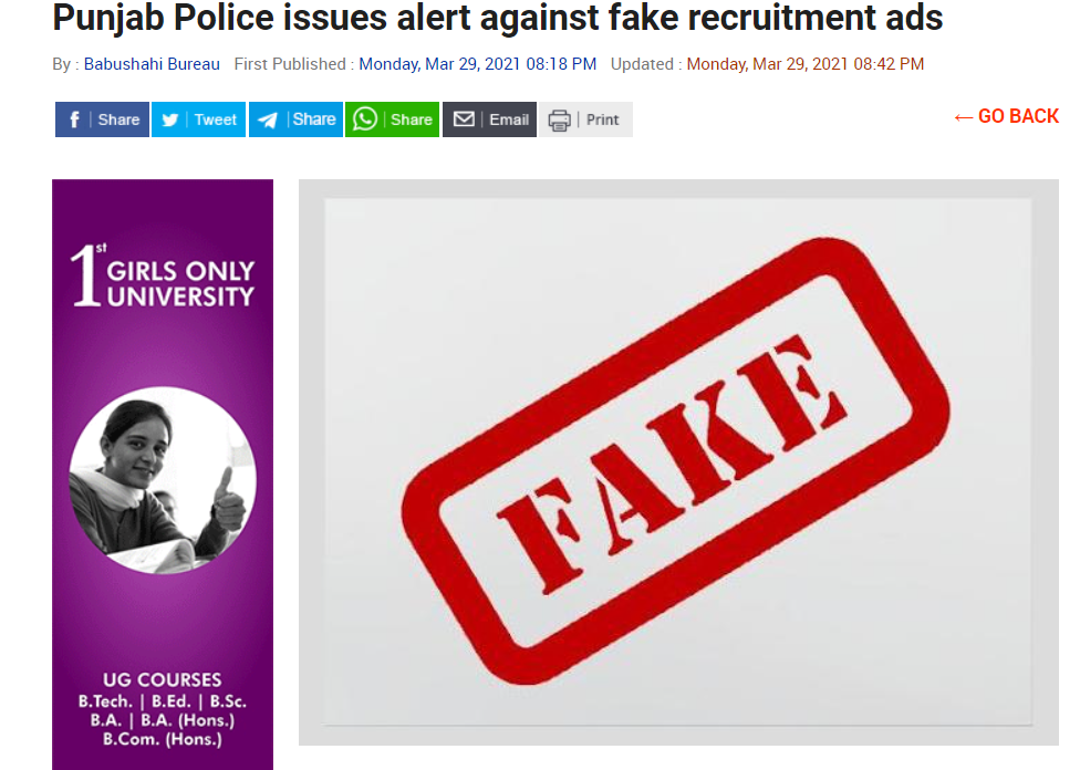 ਇਨ੍ਹੀਂ ਦਿਨੀਂ ਪੰਜਾਬ ਪੁਲਿਸ ਵਿੱਚ ਕਾਂਸਟੇਬਲ ਦੀ ਭਰਤੀ ਨੂੰ ਲੈ ਕੇ ਇਕ ਇਸ਼ਤਿਹਾਰ ਸੋਸ਼ਲ ਮੀਡੀਆ ਤੇ ਵਾਇਰਲ ਹੋ ਰਿਹਾ ਹੈ। ਦਾਅਵਾ ਕੀਤਾ ਜਾ ਰਿਹਾ ਹੈ ਕਿ ਪੰਜਾਬ ਪੁਲੀਸ ਨੇ ਕਾਂਸਟੇਬਲਾਂ ਦੀ ਭਰਤੀ ਨੂੰ ਲੈ ਕੇ ਇਸ਼ਤਿਹਾਰ ਜਾਰੀ ਕਰ ਦਿੱਤਾ ਹੈ।