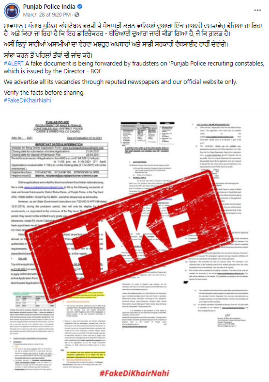 ਪੰਜਾਬ ਪੁਲੀਸ ਦੀ ਇਸ ਪੋਸਟ ਮੁਤਾਬਕ ਪੰਜਾਬ ਪੁਲੀਸ ਕਾਂਸਟੇਬਲ ਭਰਤੀ ਨੂੰ ਲੈ ਕੇ ਇਕ ਜਾਅਲੀ ਦਸਤਾਵੇਜ ਵਾਇਰਲ ਕੀਤਾ ਜਾ ਰਿਹਾ ਹੈ ਜੋ ਕਿ ਗ਼ਲਤ ਹੈ। ਪੰਜਾਬ ਪੁਲੀਸ ਨੇ ਇਹ ਵੀ ਲਿਖਿਆ ਕਿ ਇਨ੍ਹਾਂ ਸਾਰੀਆਂ ਅਸਾਮੀਆਂ ਦੇ ਵੇਰਵੇ ਨੂੰ ਉਹ ਮਸ਼ਹੂਰ ਅਖ਼ਬਾਰਾਂ ਅਤੇ ਸਰਕਾਰੀ ਵੈੱਬਸਾਈਟ ਰਾਹੀਂ ਜਾਰੀ ਕਰਨਗੇ।