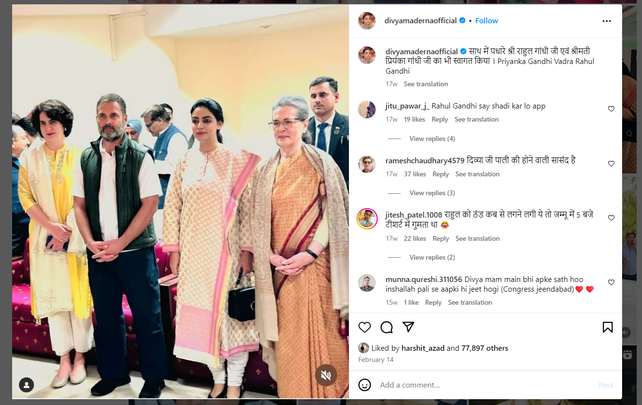 ਨਿਊਜ਼ਚੈਕਰ ਨੇ ਵਾਇਰਲ ਦਾਅਵੇ ਦੀ ਪੁਸ਼ਟੀ ਕਰਨ ਲਈ ਤਸਵੀਰ ਨੂੰ ਗੂਗਲ ਰਿਵਰਸ ਇਮੇਜ ਸਰਚ ਦੀ ਮਦਦ ਦੇ ਨਾਲ ਖੰਗਾਲਿਆ। ਸਾਨੂੰ ਇਹ ਤਸਵੀਰ ਰਾਜਸਥਾਨ ਦੀ ਓਸੀਅਨ ਸੀਟ ਤੋਂ ਸਾਬਕਾ ਵਿਧਾਇਕ ਦਿਵਿਆ ਮਹੀਪਾਲ ਮਦੇਰਨਾ ਦੇ ਇੰਸਟਾਗ੍ਰਾਮ ਅਕਾਊਂਟ ‘ਤੇ ਮਿਲੀ ਜੋ ਕਿ 14 ਫਰਵਰੀ 2024 ਨੂੰ ਅਪਲੋਡ ਕੀਤੀ ਗਈ ਸੀ । ਇਸ ਦੌਰਾਨ ਇਕ ਹੋਰ ਤਸਵੀਰ ਵੀ ਅਪਲੋਡ ਕੀਤੀ ਗਈ।
