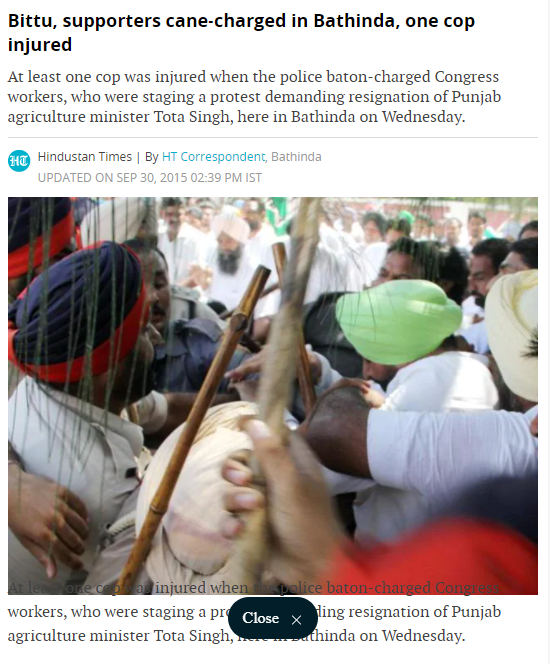 ਸਰਚ ਦੇ ਦੌਰਾਨ ਸਾਨੂੰ ਹਿੰਦੁਸਤਾਨ ਟਾਈਮਜ਼ ਦੁਆਰਾ ਇਸ ਮਾਮਲੇ ਨੂੰ ਲੈ ਕੇ ਪ੍ਰਕਾਸ਼ਿਤ ਰਿਪੋਰਟ ਮਿਲੀ। ਹਿੰਦੁਸਤਾਨ ਟਾਈਮਜ਼ ਦੀ ਰਿਪੋਰਟ ਦੇ ਮੁਤਾਬਕ ਲੁਧਿਆਣਾ ਤੋਂ ਮੈਂਬਰ ਪਾਰਲੀਮੈਂਟ ਰਵਨੀਤ ਸਿੰਘ ਬਿੱਟੂ ਬਠਿੰਡਾ ਦੇ ਡੀਸੀ ਦਫ਼ਤਰ ਬਾਹਰ ਪੰਜਾਬ ਦੇ ਸਾਬਕਾ ਖੇਤੀਬਾੜੀ ਮੰਤਰੀ ਤੋਤਾ ਸਿੰਘ ਦੇ ਖ਼ਿਲਾਫ਼ ਧਰਨਾ ਦੇ ਰਹੇ ਸਨ ਜਿਸ ਦੌਰਾਨ ਕਾਂਗਰਸੀ ਵਰਕਰਾਂ ਅਤੇ ਸਮਰਥਕਾਂ ਦੇ ਵੱਲੋਂ ਡੀਸੀ ਦਫ਼ਤਰ ਦਾ ਘਿਰਾਓ ਕਰਨ ਦੀ ਕੋਸ਼ਿਸ਼ ਕੀਤੀ ਗਈ ਅਤੇ ਇਸ ਵਿੱਚ ਪੁਲੀਸ ਨੇ ਉਨ੍ਹਾਂ ਤੇ ਲਾਠੀਚਾਰਜ ਕਰ ਦਿੱਤਾ। ਹਿੰਦੁਸਤਾਨ ਟਾਈਮਜ਼ ਨੇ ਵੀ ਇਸ ਰਿਪੋਰਟ ਨੂੰ ਸਤੰਬਰ 30,2015 ਨੂੰ ਪ੍ਰਕਾਸ਼ਿਤ ਕੀਤਾ ਸੀ।