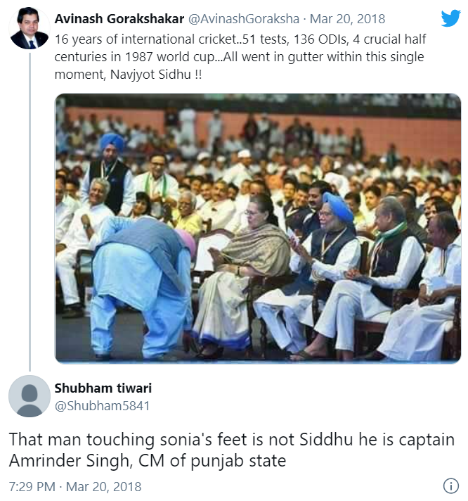 ਸੋਸ਼ਲ ਮੀਡੀਆ ਤੇ ਇਕ ਟਵਿੱਟਰ ਯੂਜ਼ਰ ‘ਪੀਪਲ ਆਫ ਇੰਡੀਆ’ ਨੇ ਤਸਵੀਰ ਨੂੰ ਸ਼ੇਅਰ ਕਰਦਿਆਂ ਲਿਖਿਆ,”ਨਵਜੋਤ ਸਿੱਧੂ ਨੇ ਐਤਵਾਰ ਨੂੰ ਸੋਨੀਆ ਗਾਂਧੀ ਦੇ ਪੈਰ ਛੁਏ।” ਅਸੀਂ ਪਾਇਆ ਕਿ ਇਸ ਤਸਵੀਰ ਨੂੰ ਹੁਣ ਤਕ ਟਵਿੱਟਰ ‘ਤੇ 150 ਤੋਂ ਵੱਧ ਯੂਜ਼ਰ ਲਾਇਕ ਕਰ ਚੁੱਕੇ ਹਨ ਜਦਕਿ 43 ਯੂਜ਼ਰਾਂ ਨੇ ਇਸ ਤਸਵੀਰ ਨੂੰ ਰੀਟਵੀਟ ਕੀਤਾ।