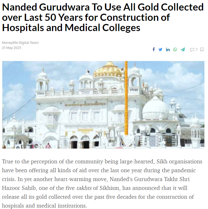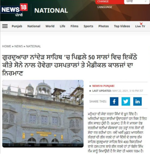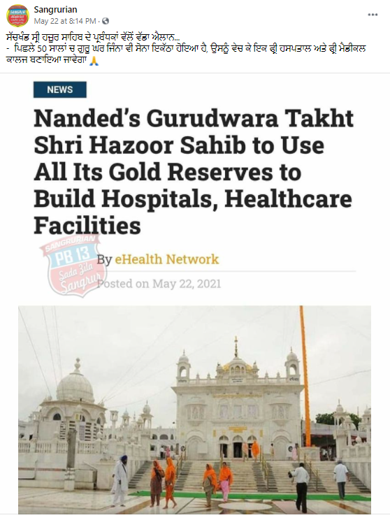 ਸੋਸ਼ਲ ਮੀਡਿਆ ਤੇ ਗੁਰੂਦੁਆਰਾ ਸ਼੍ਰੀ ਸੱਚਖੰਡ ਨਾਂਦੇੜ ਸਾਹਿਬ ਨੂੰ ਲੈ ਕੇ ਇੱਕ ਦਾਅਵਾ ਵਾਇਰਲ ਹੋ ਰਿਹਾ ਹੈ। ਦਾਅਵਾ ਕੀਤਾ ਜਾ ਰਿਹਾ ਹੈ ਕਿ Takht Hazur Sahib ਵੱਲੋਂ ਪਿਛਲੇ 5 ਦਸ਼ਕਾਂ (50 ਸਾਲ) ਵਿਚ ਇਕੱਠਾ ਹੋਇਆ ਸੋਨਾ, ਸੰਗਤਾਂ ਦੀ ਸੇਵਾ ਲਈ ਦਾਨ ਕੀਤਾ ਜਾਵੇਗਾ। ਦਾਅਵੇ ਦੇ ਮੁਤਾਬਕ , 50 ਸਾਲ ਵਿੱਚ ਇਕੱਠੇ ਹੋਏ ਸੋਨਾ ਨੂੰ ਵੇਚ ਕੇ ਸੰਗਤਾਂ ਲਈ ਹਸਪਤਾਲ, ਸਕੂਲ ਅਤੇ ਜਰੂਰੀ ਸੇਵਾਵਾਂ ਲਈ ਕੰਮ ਕੀਤੇ ਜਾਣਗੇ।