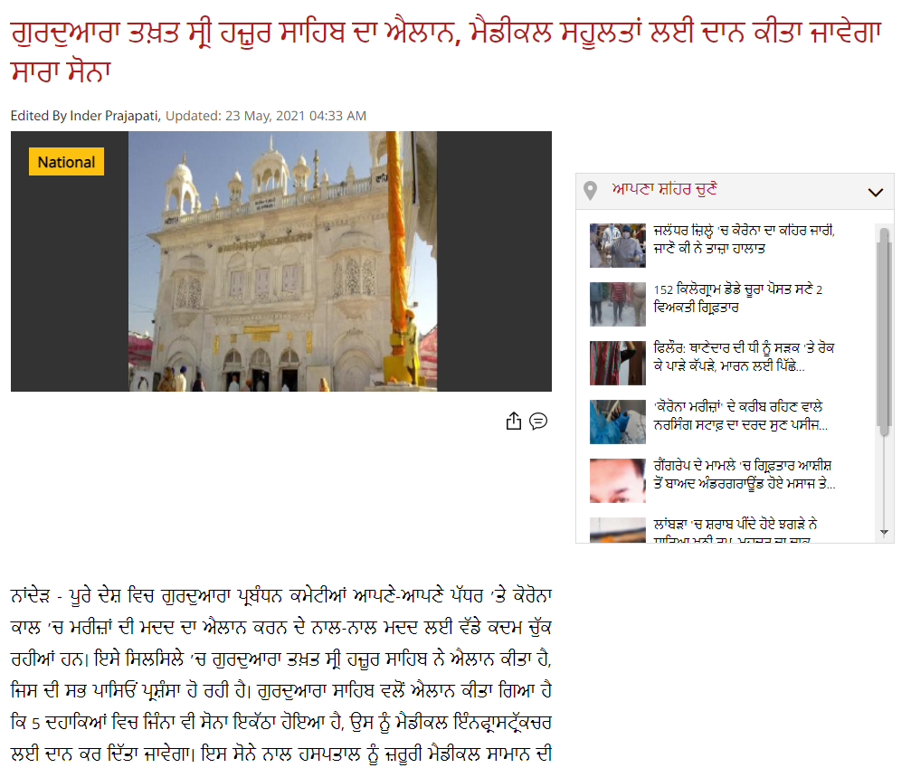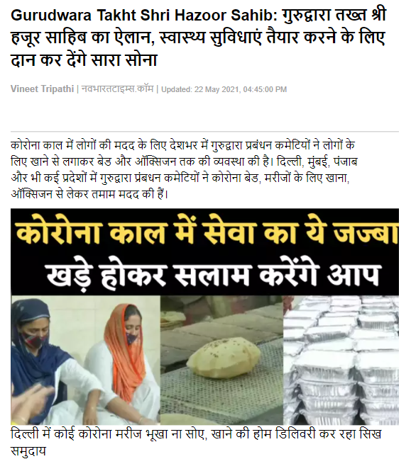 ਦੇਸ਼ ਵਿਚ ਕੋਰੋਨਾ ਮਹਾਂਮਾਰੀ ਦੇ ਦੌਰਾਨ ਕਈ ਸੰਸਥਾਨ ਅਤੇ ਐਨਜੀਓ ਸੇਵਾ ਦੇ ਲਈ ਅੱਗੇ ਆਏ। ਇਸ ਦੌਰਾਨ ਸੋਸ਼ਲ ਮੀਡਿਆ ਤੇ ਦਾਅਵਾ ਕੀਤਾ ਜਾ ਰਿਹਾ ਹੈ ਕਿ ਤਖ਼ਤ ਹਜ਼ੂਰ ਸਾਹਿਬ ਵਲੋਂ ਪਿਛਲੇ 50 ਸਾਲ ਵਿਚ ਇਕੱਠਾ ਹੋਇਆ ਸੋਨਾ, ਸੰਗਤਾਂ ਦੀ ਸੇਵਾ ਲਈ ਦਾਨ ਕੀਤਾ ਜਾਵੇਗਾ।