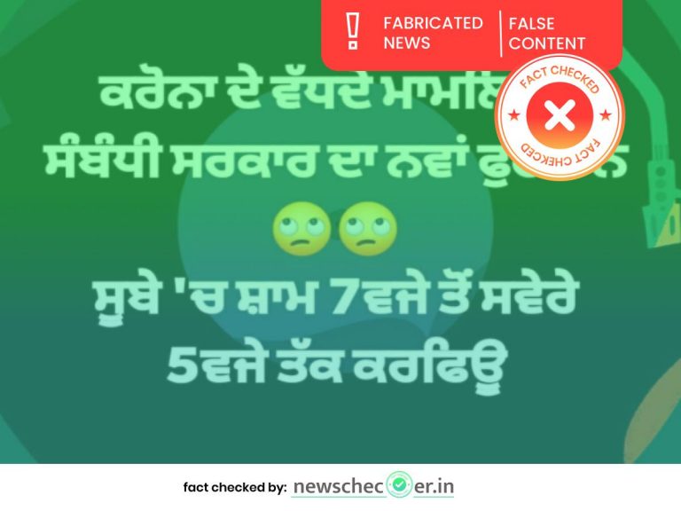 ਸੋਸ਼ਲ ਮੀਡੀਆ ਤੇ ਇੱਕ ਵੀਡੀਓ ਵਾਇਰਲ ਹੋਈ ਜਿਸ ਮੁਤਾਬਿਕ ਵੱਧ ਰਹੇ ਕੋਰੋਨਾ ਵਾਇਰਸ ਦੇ ਮਾਮਲਿਆਂ ਦੇ ਚੱਲਦਿਆਂ ਪੰਜਾਬ ਦੇ ਵਿੱਚ ਕਰਫਿਊ ਦੇ ਸਮੇਂ ਵਿਚ ਬਦਲਾਅ ਕੀਤਾ ਗਿਆ ਹੈ। ਵਾਇਰਲ ਹੋ ਰਹੀ ਖਬਰ ਮੁਤਾਬਿਕ, ਪੰਜਾਬ ਵਿੱਚ ਹੁਣ ਕਰਫਿਊ ਦਾ ਸਮਾਂ ਸ਼ਾਮ 7 ਵਜੇ ਤੋਂ ਲੈ ਕੇ ਸਵੇਰੇ 5 ਵਜੇ ਕਰ ਦਿੱਤਾ ਗਿਆ ਹੈ। ਨਿਊਜ਼ਚੈਕਰ ਨੇ ਪੜਤਾਲ ਦੇ ਵਿੱਚ ਪਾਇਆ ਕਿਵਾਇਰਲ ਹੋ ਰਹੀ ਖਬਰ ਪੁਰਾਣੀ ਹੈ ਜਿਸ ਨੂੰ ਮੁੜ ਤੋਂ ਫਰਜ਼ੀ ਦਾਅਵੇ ਦੇ ਨਾਲ ਸ਼ੇਅਰ ਕੀਤਾ ਗਿਆ ਸੀ।