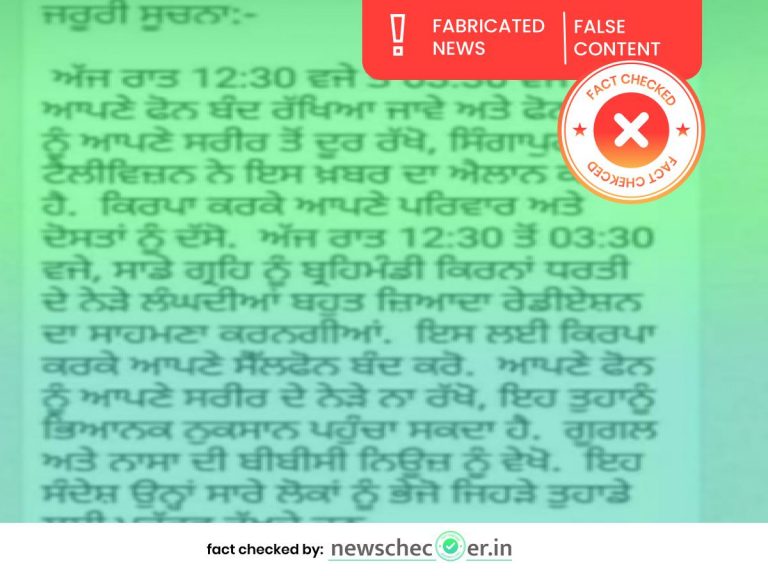 ਸੋਸ਼ਲ ਮੀਡਿਆ ਤੇ ਇੱਕ ਮੈਸਜ਼ ਅਤੇ ਆਡੀਓ ਵਾਇਰਲ ਹੋਈ ਜਿਸ ਮੁਤਾਬਕ ਰਾਤ 12:30 ਤੋਂ 3:30 ਤਕ Mobile Phone ਬੰਦ ਰੱਖੋ ਕਿਓਂਕਿ ਆਸਮਾਨ ਤੋਂ ਖ਼ਤਰਨਾਕ ਕੋਸਮਿਕ ਦੀਆਂ ਕਿਰਨਾਂ ਗੁਜਰਨਗੀਆਂ। ਨਿਊਜ਼ਚੈਕਰ ਨੇ ਪੜਤਾਲ ਦੇ ਵਿੱਚ ਪਾਇਆ ਕਿ ਵਾਇਰਲ ਹੋ ਰਹੇ ਮੈਸਜ਼ ਵਿੱਚ ਕੋਈ ਸਚਾਈ ਨਹੀਂ ਹੈ। ਵਾਇਰਲ ਹੋ ਰਹੇ ਮੈਸਜ਼ ਨੂੰ ਫਰਜ਼ੀ ਦਾਅਵੇ ਦੇ ਨਾਲ ਸੋਸ਼ਲ ਮੀਡੀਆ ਤੇ ਸ਼ੇਅਰ ਕੀਤਾ ਜਾ ਰਿਹਾ ਸੀ।