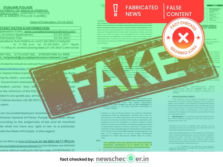 ਪੰਜਾਬ ਪੁਲਿਸ ਵਿੱਚ ਕਾਂਸਟੇਬਲ ਦੀ ਭਰਤੀ ਨੂੰ ਲੈ ਕੇ ਇਕ ਇਸ਼ਤਿਹਾਰ ਸੋਸ਼ਲ ਮੀਡੀਆ ਤੇ ਖੂਬ ਵਾਇਰਲ ਹੋਇਆ ਜਿਸ ਨਾਲ ਦਾਅਵਾ ਕੀਤਾ ਗਿਆ ਕਿ ਪੰਜਾਬ ਪੁਲੀਸ ਨੇ ਕਾਂਸਟੇਬਲਾਂ ਦੀ ਭਰਤੀ ਨੂੰ ਲੈ ਕੇ ਇਸ਼ਤਿਹਾਰ ਜਾਰੀ ਕਰ ਦਿੱਤਾ ਹੈ। ਅਸੀਂ ਆਪਣੀ ਪੜਤਾਲ ਦੇ ਵਿੱਚ ਪਾਇਆ ਕਿ ਵਾਇਰਲ ਹੋ ਰਿਹਾ ਪੰਜਾਬ ਪੁਲੀਸ ਦਾ ਨੋਟੀਫਿਕੇਸ਼ਨ ਫ਼ਰਜ਼ੀ ਹੈ। ਪੰਜਾਬ ਪੁਲੀਸ ਨੇ ਕਾਂਸਟੇਬਲ ਭਰਤੀ ਨੂੰ ਲੈ ਕੇ ਕਿਸੇ ਤਰ੍ਹਾਂ ਦਾ ਕੋਈ ਇਸ਼ਤਿਹਾਰ ਜਾਰੀ ਨਹੀਂ ਕੀਤਾ ਗਿਆ ਸੀ।