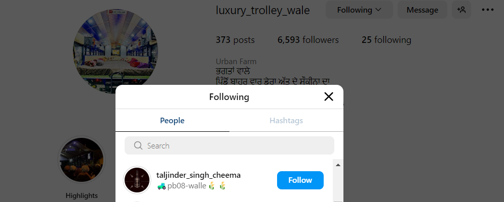 ਜਦੋਂ ਅਸੀਂ ਇਸ ਪੇਜ ਨੂੰ ਖੋਲਿਆ ਤਾਂ ਪਾਇਆ ਕਿ ਇਹ ਪੇਜ ਚੀਮਾ ਗੋਤ ਦੇ ਇੱਕ ਯੂਜ਼ਰ ਤਲਜਿੰਦਰ ਸਿੰਘ ਚੀਮਾ ਨੂੰ ਫੋਲੋ ਕਰਦਾ ਹੈ। ਵਾਇਰਲ ਵੀਡੀਓ ਵਿੱਚ ਟਰਾਲੀ ਉੱਤੇ ਵੀ “ਚੀਮਾ ਐਗਰੀ ਫਾਰਮ” ਲਿਖਿਆ ਹੋਇਆ ਸੀ, ਇਸ ਲਈ ਅਸੀਂ ਉਤਸੁਕਤਾ ਨਾਲ ਇਹ ਖਾਤਾ ਖੋਲ੍ਹਿਆ।