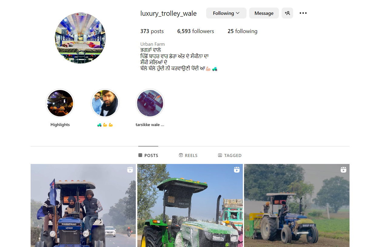 ਜਦੋਂ ਅਸੀਂ ਵਾਇਰਲ ਵੀਡੀਓ ਵਿੱਚ ਦਿਖਾਈ ਦੇਣ ਵਾਲੀ ਟਰਾਲੀ ‘ਤੇ PAW ਤੋਂ ਬਾਅਦ ਅੰਗਰੇਜ਼ੀ ਵਿੱਚ ਲਿਖੇ ਟੈਕਸਟ ਨੂੰ ਦੇਖਿਆ, ਤਾਂ ਸਾਨੂੰ “ਚੀਮਾ ਐਗਰੀ ਫਾਰਮ” ਅਸਪਸ਼ਟ ਰੂਪ ਵਿੱਚ ਲਿਖਿਆ ਹੋਇਆ ਮਿਲਿਆ। ਇਸ ਤੋਂ ਬਾਅਦ ਅਸੀਂ ਚੀਮਾ ਐਗਰੀ ਫਾਰਮ ਕੀ ਵਰਡਸ ਦੀ ਮਦਦ ਨਾਲ ਇੰਸਟਾਗ੍ਰਾਮ ‘ਤੇ ਖੋਜ ਕੀਤੀ। ਸਾਨੂੰ ਇਸ ਪ੍ਰਕਿਰਿਆ ਦੌਰਾਨ ਕੋਈ ਖਾਸ ਜਾਣਕਾਰੀ ਨਹੀਂ ਮਿਲੀ ਪਰ ਇਸ ਦੌਰਾਨ ਸਾਨੂੰ ਲਗਜ਼ਰੀ ਟਰਾਲੀ ਵਾਲੇ ਨਾਮ ਦਾ ਇੱਕ ਇੰਸਟਾਗ੍ਰਾਮ ਪੇਜ ਮਿਲਿਆ । ਇਸ ਪੇਜ ‘ਤੇ ਪੰਜਾਬ ਦੇ ਟਰੈਕਟਰਾਂ ਅਤੇ ਟਰਾਲੀਆਂ ਦੀਆਂ ਫੋਟੋਆਂ ਅਤੇ ਵੀਡੀਓ ਵੀ ਮੌਜੂਦ ਸਨ।