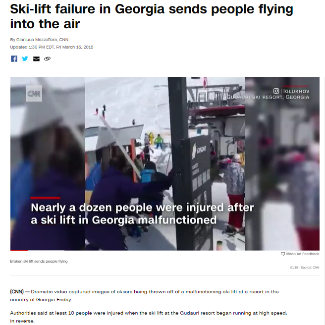 ਦਿੱਤੀ ਗਈ ਜਾਣਕਾਰੀ ਦੇ ਮੁਤਾਬਕ ਇਹ ਮਾਮਲਾ ਯੂਰੋਪ ਦੇ ਜੋਰਜਿਆ ਦਾ ਹੈ ਜਿਥੇ ਸਕਾਈ ਲਿਫਟ ਕੇਬਲ ਫੇਲ ਹੋ ਜਾਣ ਦੇ ਕਾਰਨ ਹਾਦਸਾ ਵਾਪਰ ਗਿਆ ਅਤੇ ਇਸ ਹਾਦਸੇ ਦੇ ਵਿੱਚ 10 ਤੋਂ ਵੱਧ ਲੋਕ ਜਖਮੀ ਹੋ ਗਏ।