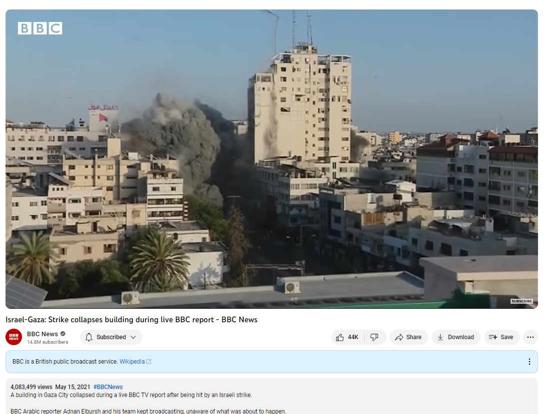 ਇਸ ਤੋਂ ਬਾਅਦ, ਅਸੀਂ ਕੀਵਰਡਸ ਦੀ ਮਦਦ ਨਾਲ ਰਿਪੋਰਟਾਂ ਦੀ ਖੋਜ ਕੀਤੀ। ਸਾਨੂੰ 15 ਮਈ, 2021 ਨੂੰ ਬੀਬੀਸੀ ਦੇ ਯੂਟਿਊਬ ਚੈਨਲ ‘ਤੇ ਅਪਲੋਡ ਕੀਤੀ ਗਈ ਰਿਪੋਰਟ ਮਿਲੀ । ਇਸ ਵੀਡੀਓ ਰਿਪੋਰਟ ਮੁਤਾਬਕ ਜਦੋਂ ਬੀਬੀਸੀ ਰਿਪੋਰਟਰ ਅਦਨਾਨ ਅਲਬੁਰਸ਼ ਕੈਮਰੇ ਦੇ ਸਾਹਮਣੇ ਰਿਪੋਰਟਿੰਗ ਕਰ ਰਹੇ ਸਨ ਤਾਂ ਉਨ੍ਹਾਂ ਦੇ ਪਿੱਛੇ ਅਲ-ਸ਼ੌਰੌਕ ਟਾਵਰ ‘ਤੇ ਹਮਲਾ ਕੀਤਾ ਜਾ ਰਿਹਾ ਸੀ। ਬਾਅਦ ਵਿੱਚ ਇਸ ਵੀਡੀਓ ਰਿਪੋਰਟ ਵਿੱਚ ਇਮਾਰਤ ਦੇ ਪੂਰੀ ਤਰ੍ਹਾਂ ਤਬਾਹ ਹੋਣ ਦੇ ਸਾਰੇ ਦ੍ਰਿਸ਼ ਦਿਖਾਏ ਗਏ ਹਨ।