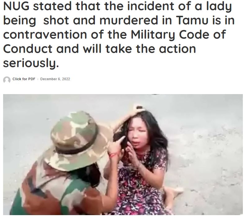 ਸਾਨੂੰ ‘Clickforpdf’ ਨਾਂ ਦੀ ਵੈੱਬਸਾਈਟ ‘ਤੇ ਦਸੰਬਰ 2022 ਵਿੱਚ ਪ੍ਰਕਾਸ਼ਿਤ ਇੱਕ ਰਿਪੋਰਟ ਮਿਲੀ। ਇਸ ਵਿੱਚ ਵਾਇਰਲ ਵੀਡੀਓ ਦੀ ਸਕਰੀਨਗਰਾਬ ਸ਼ਾਮਲ ਹੈ। ਰਿਪੋਰਟ ‘ਚ ਦਿੱਤੀ ਗਈ ਜਾਣਕਾਰੀ ਮੁਤਾਬਕ ਇਹ ਘਟਨਾ ਮਿਆਂਮਾਰ ਦੇ ਤਾਮੂ ਸ਼ਹਿਰ ਦੀ ਹੈ। ਉਥੋਂ ਦੀ ਸਰਕਾਰ ਨੇ ਕਿਹਾ ਕਿ ਸੋਸ਼ਲ ਮੀਡੀਆ ‘ਤੇ ਵਾਇਰਲ ਹੋ ਰਹੇ ਵੀਡੀਓ ‘ਚ ਤਮੂ ਦੇ ਸਾਗਿੰਗ ਇਲਾਕੇ ‘ਚ ਇਕ ਔਰਤ ਨੂੰ ਗੋਲੀ ਮਾਰ ਕੇ ਮਾਰਿਆ ਜਾਂਦਾ ਦਿਖਾਇਆ ਗਿਆ ਹੈ। ਇਹ ਚੋਣ ਜ਼ਾਬਤੇ ਦੀ ਉਲੰਘਣਾ ਹੈ ਅਤੇ ਦੋਸ਼ੀਆਂ ਨੂੰ ਸਖ਼ਤ ਸਜ਼ਾ ਦਿੱਤੀ ਜਾਵੇਗੀ।