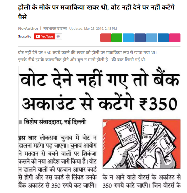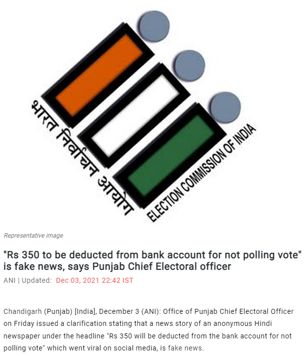 ਸੋਸ਼ਲ ਮੀਡੀਆ ਤੇ ਅਖ਼ਬਾਰ ਦੀ ਕਲਿਪਿੰਗ ਵਾਇਰਲ ਹੋ ਰਹੀ ਹੈ ਜਿਸ ਮੁਤਾਬਕ Vote ਨਾ ਪਾਉਣ ਤੇ ਅਕਾਊਂਟ ਚੋਂ 350 ਰੁਪਏ ਕੱਟੇ ਜਾਣਗੇ। ਸੋਸ਼ਲ ਮੀਡੀਆ ਤੇ ਵਾਇਰਲ ਅਖਬਾਰ ਦੀ ਕਲਿਪਿੰਗ ਦੇ ਮੁਤਾਬਕ ਇਲੈਕਸ਼ਨ ਕਮਿਸ਼ਨ ਨੇ ਇਸ ਦੀ ਮਨਜ਼ੂਰੀ ਕੋਰਟ ਤੋਂ ਲੈ ਲਈ ਹੈ। ਇਸ ਦੇ ਨਾਲ ਹੀ ਇਹ ਵੀ ਦਾਅਵਾ ਕੀਤਾ ਜਾ ਰਿਹਾ ਹੈ ਕਿ ਜੇਕਰ ਬੈਂਕ ਅਕਾਉਂਟ ਨਹੀਂ ਹੈ ਤਾਂ ਪੈਸੇ ਮੋਬਾਈਲ ਰਿਚਾਰਜ ਰਾਹੀਂ ਕੱਟੇ ਜਾਣਗੇ।
