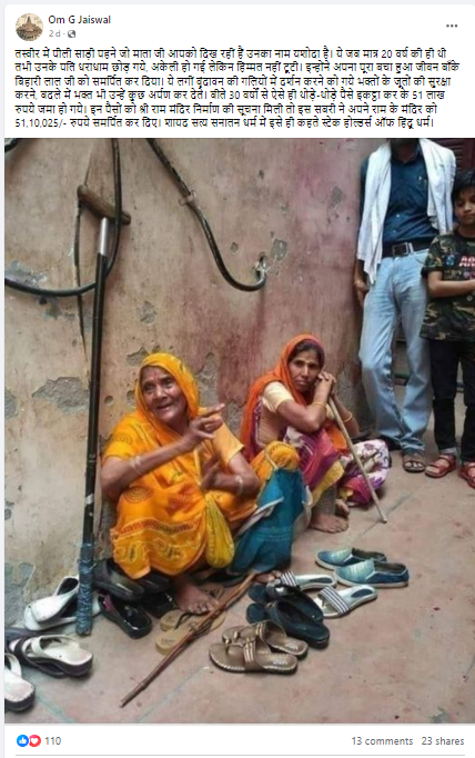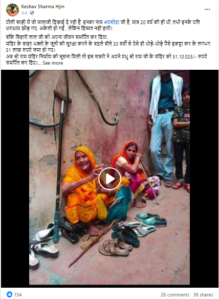 ਫੇਸਬੁੱਕ ‘ਤੇ ਇਕ ਤਸਵੀਰ ਦੇ ਨਾਲ ਇਹ ਦਾਅਵਾ ਵਾਇਰਲ ਹੋ ਰਿਹਾ ਹੈ ਕਿ 20 ਸਾਲ ਦੀ ਉਮਰ ‘ਚ ਯਸ਼ੋਦਾ ਨੂੰ ਉਨ੍ਹਾਂ ਦੇ ਪਤੀ ਨੇ ਛੱਡ ਦਿੱਤਾ ਸੀ, ਉਦੋਂ ਤੋਂ ਉਨ੍ਹਾਂ ਨੇ ਆਪਣਾ ਜੀਵਨ ਬਾਂਕੇ ਬਿਹਾਰੀ ਲਾਲ ਨੂੰ ਸਮਰਪਿਤ ਕਰ ਦਿੱਤਾ ਸੀ। ਉਹ ਵਰਿੰਦਾਵਨ ਦੀਆਂ ਗਲੀਆਂ ਵਿੱਚ ਦਰਸ਼ਨਾਂ ਲਈ ਆਏ ਸ਼ਰਧਾਲੂਆਂ ਦੀਆਂ ਜੁੱਤੀਆਂ ਦੀ ਰਾਖੀ ਕਰਨ ਲੱਗੀ ਜਿਸ ਨਾਲ 30 ਸਾਲਾਂ ‘ਚ 51 ਲੱਖ ਰੁਪਏ ਜਮ੍ਹਾ ਕੀਤੇ। ਪੋਸਟ ਦੇ ਅਨੁਸਾਰ, ਜਦੋਂ ਉਸਨੂੰ ਰਾਮ ਮੰਦਰ ਦੇ ਨਿਰਮਾਣ ਦੀ ਜਾਣਕਾਰੀ ਮਿਲੀ ਤਾਂ ਉਸ ਨੇ 51,10,025/- ਰੁਪਏ ਰਾਮ ਮੰਦਰ ਨੂੰ ਸਮਰਪਿਤ ਕਰ ਦਿੱਤੇ। ਵਾਇਰਲ ਪੋਸਟਾਂ ਨੂੰ ਇੱਥੇ ਅਤੇ ਇੱਥੇ ਦੇਖਿਆ ਜਾ ਸਕਦਾ ਹੈ ।