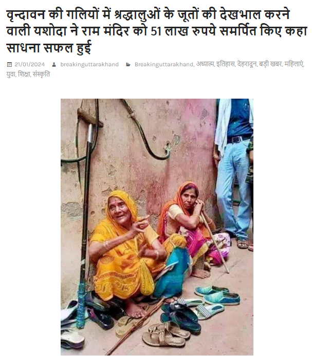 22 ਮਈ, 2017 ਨੂੰ ‘ਸ਼੍ਰੀ ਬਾਂਕੇ ਬਿਹਾਰੀ ਜੀ ਵਰਿੰਦਾਵਨ’ ਨਾਮ ਦੇ ਇੱਕ ਫੇਸਬੁੱਕ ਪੇਜ ਦੁਆਰਾ ਸ਼ੇਅਰ ਕੀਤੀ ਗਈ ਇੱਕ ਪੋਸਟ ਵਿੱਚ ਦੱਸਿਆ ਗਿਆ ਹੈ ਕਿ ਤਸਵੀਰ ਵਿੱਚ ਨਜ਼ਰ ਆ ਰਹੀ ਔਰਤ ਦਾ ਨਾਮ ਯਸ਼ੋਦਾ ਹੈ, ਜੋ ਜੁੱਤੀਆਂ ਅਤੇ ਚੱਪਲਾਂ ਦੀ ਦੇਖਭਾਲ ਕਰਦੀ ਹੈ। ਉਹ 20 ਸਾਲ ਦੀ ਉਮਰ ਵਿੱਚ ਵਿਧਵਾ ਹੋ ਗਈ। ਉਨ੍ਹਾਂ ਨੇ ਪਿਛਲੇ 30 ਸਾਲਾਂ ਵਿੱਚ 51,02,550 ਰੁਪਏ ਇਕੱਠੇ ਕਰਨ ਤੋਂ ਬਾਅਦ 40 ਲੱਖ ਰੁਪਏ ਦੀ ਰਾਸ਼ੀ ਨਾਲ ਗਊ ਸ਼ੈੱਡ ਅਤੇ ਧਰਮਸ਼ਾਲਾ ਦੀ ਉਸਾਰੀ ਸ਼ੁਰੂ ਕੀਤੀ ਹੈ।