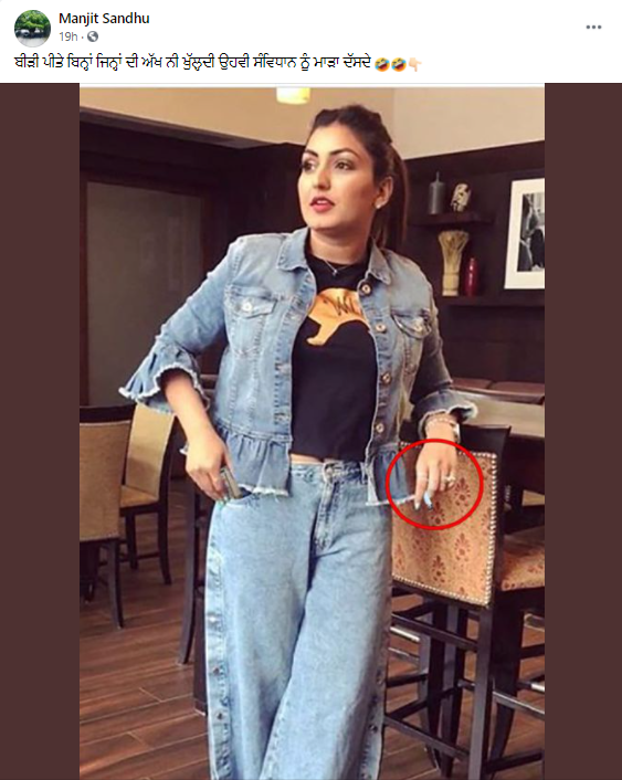 ਇਸ ਦੌਰਾਨ ਸੋਸ਼ਲ ਮੀਡਿਆ ਤੇ ਆਮ ਆਦਮੀ ਪਾਰਟੀ ਦੇ ਸਹਿ ਪ੍ਰਧਾਨ ਅਨਮੋਲ ਗਗਨ ਮਾਨ ਦੀਆਂ ਦੋ ਤਸਵੀਰਾਂ ਵਾਇਰਲ ਹੋ ਰਹੀਆਂ ਹਨ ਜਿਸ ਵਿੱਚ ਉਹਨਾਂ ਦੇ ਹੱਥ ਵਿਚ ਸਿਗਰੇਟ ਨਜ਼ਰ ਆ ਰਹੀ ਹੈ। ਅਸੀਂ ਸੋਸ਼ਲ ਮੀਡਿਆ ਤੇ ਵਾਇਰਲ ਤਸਵੀਰ ਦੀ ਜਾਂਚ ਸ਼ੁਰੂ ਕੀਤੀ। ਅਸੀਂ ਪੜਤਾਲ ਦੇ ਦੌਰਾਨ ਪਾਇਆ ਕਿ ਕਈ ਫੇਸਬੁੱਕ ਯੂਜ਼ਰਾਂ ਨੇ ਤਸਵੀਰ ਨੂੰ ਫੇਕ ਦੱਸਿਆ।
