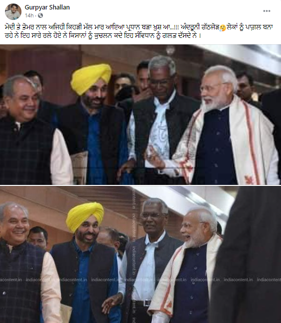 ਇਸ ਦੌਰਾਨ ਸੋਸ਼ਲ ਮੀਡੀਆ ਤੇ ਪ੍ਰਧਾਨ ਮੰਤਰੀ ਨਰਿੰਦਰ ਮੋਦੀ ਅਤੇ ਸੰਸਦ ਮੈਂਬਰ ਭਗਵੰਤ ਮਾਨ ਦੀ ਤਸਵੀਰ ਵਾਇਰਲ ਹੋ ਰਹੀ ਹੈ ਜਿਸ ਵਿਚ ਪ੍ਰਧਾਨ ਮੰਤਰੀ ਮੋਦੀ ਅਤੇ ਭਗਵੰਤ ਮਾਨ ਨੂੰ ਹੱਸਦਿਆਂ ਹੋਇਆ ਦੇਖਿਆ ਜਾ ਸਕਦਾ ਹੈ। ਦਾਅਵਾ ਕੀਤਾ ਜਾ ਰਿਹਾ ਹੈ ਕਿ ਇਹ ਤਸਵੀਰ ਮੌਜੂਦਾ ਪਾਰਲੀਮੈਂਟ ਸੈਸ਼ਨ ਦੀ ਹੈ।
