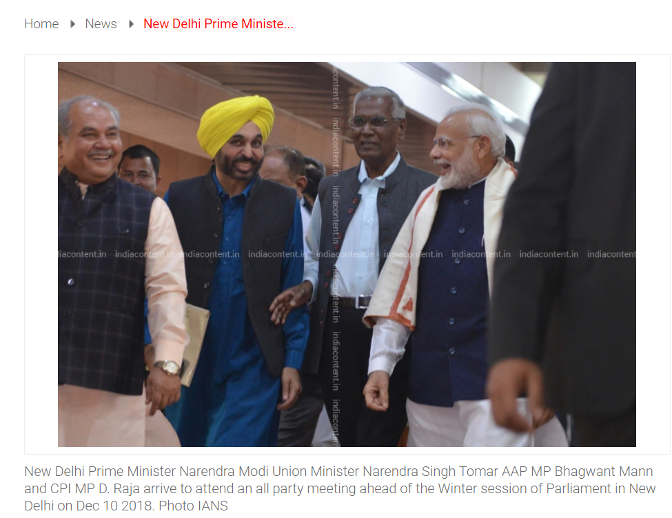 ਸਰਚ ਦੇ ਦੌਰਾਨ ਸਾਨੂੰ ਵਾਇਰਲ ਹੋ ਰਹੀ ਤਸਵੀਰ IndiaContent ਨਾਮਕ ਵੈੱਬਸਾਈਟ ਤੇ ਮਿਲੀ ਜਿਸ ਦੇ ਕੈਪਸ਼ਨ ਦੇ ਮੁਤਾਬਕ ਇਹ ਤਸਵੀਰ 10 ਦਸੰਬਰ 2018 ਨੂੰ ਸਰਦ ਰੁੱਤ ਇਜਲਾਸ ਦੇ ਸ਼ੁਰੂ ਹੋਣ ਤੋਂ ਪਹਿਲਾਂ ਲਈ ਗਈ ਸੀ ਜਿਸ ਵਿੱਚ ਪ੍ਰਧਾਨ ਮੰਤਰੀ ਨਰਿੰਦਰ ਮੋਦੀ, ਕੇਂਦਰੀ ਮੰਤਰੀ ਨਰਿੰਦਰ ਸਿੰਘ ਤੋਮਰ ,ਆਮ ਆਦਮੀ ਪਾਰਟੀ ਸੰਸਦ ਮੈਂਬਰ ਭਗਵੰਤ ਮਾਨ ਅਤੇ ਕਮਿਊਨਿਸਟ ਪਾਰਟੀ ਦੇ ਡੀ. ਰਾਜਾ ਸਰਦ ਰੁੱਤ ਇਜਲਾਸ ਵਿੱਚ ਸ਼ਾਮਿਲ ਹੋਣ ਤੋਂ ਪਹਿਲਾਂ ਆਲ- ਪਾਰਟੀ ਮੀਟਿੰਗ ਦੇ ਲਈ ਨਵੀਂ ਦਿੱਲੀ ਵਿਖੇ ਇਕੱਠੇ ਹੋਏ ਸਨ।