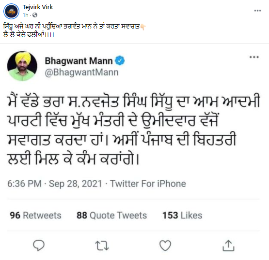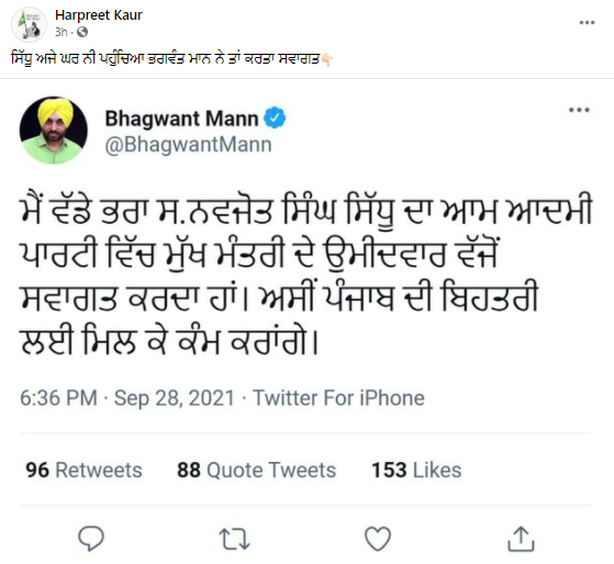 ਫੇਸਬੁੱਕ ਯੂਜ਼ਰ ‘ਹਰਪ੍ਰੀਤ ਕੌਰ’ ਨੇ ਇਸ ਟਵੀਟ ਨੂੰ ਸ਼ੇਅਰ ਕਰਦਿਆਂ ਲਿਖਿਆ,’ਸਿੱਧੂ ਅਜੇ ਘਰ ਨਹੀਂ ਪਹੁੰਚਿਆ ਭਗਵੰਤ ਮਾਨ ਨੇ ਤਾਂ ਕਰਤਾ ਸਵਾਗਤ।’