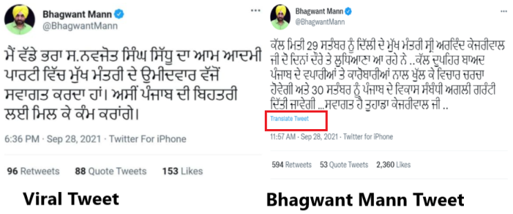 ਅਸੀਂ ਸੋਸ਼ਲ ਮੀਡੀਆ ਤੇ ਵਾਇਰਲ ਹੋ ਰਹੇ ਟਵੀਟ ਨੂੰ ਹੋਰ ਖੰਗਾਲਿਆ। ਅਸੀਂ ਭਗਵੰਤ ਮਾਨ ਦੁਆਰਾ ਪਹਿਲਾਂ ਕੀਤੇ ਗਏ ਟਵੀਟ ਤੇ ਵਾਇਰਲ ਹੋ ਰਹੇ ਟਵੀਟ ਨੂੰ ਗੌਰ ਦੇ ਨਾਲ ਦੇਖਿਆ। ਅਸੀਂ ਪਾਇਆ ਕਿ ਸੋਸ਼ਲ ਮੀਡੀਆ ਤੇ ਵਾਇਰਲ ਹੋ ਰਹੇ ਟਵੀਟ ਵਿੱਚ ਕੁਝ ਖਾਮੀਆਂ ਹਨ। ਸੋਸ਼ਲ ਮੀਡੀਆ ਤੇ ਭਗਵੰਤ ਮਾਨ ਦੇ ਨਾਮ ਤੋਂ ਵਾਇਰਲ ਹੋ ਰਹੇ ਟਵੀਟ ‘ਚ ਟਵੀਟ ਨੂੰ ਟਰਾਂਸਲੇਟ ਦਾ ਆਪਸ਼ਨ ਨਹੀਂ ਦਿਖਾਈ ਦੇ ਰਿਹਾ।