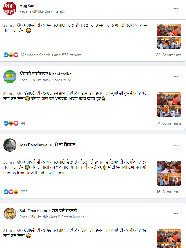 ਫੇਸਬੁੱਕ ਪੇਜ Aggbani ਨੇ ਇਸ ਤਸਵੀਰ ਨੂੰ ਸ਼ੇਅਰ ਕਰਦਿਆਂ ਲਿਖਿਆ,”ਬੰਗਾਲੀ ਵੀ ਕਮਾਲ ਕਰ ਗਏ , ਵੋਟਾਂ ਤੋਂ ਪਹਿਲਾਂ ਹੀ ਭਾਜਪਾ ਵਾਲ਼ਿਆਂ ਦੀ ਕੁਰਸੀਆਂ ਨਾਲ ਸੇਵਾਂ ਕਰ ਦਿੱਤੀ”।