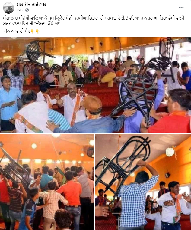 ਫੇਸਬੁੱਕ ਯੂਜ਼ਰ ਮਲਕੀਤ ਗਰੇਵਾਲ ਨੇ ਇਨ੍ਹਾਂ ਤਸਵੀਰਾਂ ਨੂੰ ਬੀਜੇਪੀ ਵਰਕਰਾਂ ਦੀ ਆਪਸੀ ਲੜਾਈ ਦੱਸਦੇ ਹੋਏ ਸੋਸ਼ਲ ਮੀਡੀਆ ਤੇ ਸ਼ੇਅਰ ਕੀਤਾ। ਮਲਕੀਅਤ ਗਰੇਵਾਲ ਨੇ ਤਸਵੀਰ ਨੂੰ ਸ਼ੇਅਰ ਕਰਦਿਆਂ ਲਿਖਿਆ,”ਬੰਗਾਲ ਚ ਬੀਜੇਪੀ ਵਾਲਿਆਂ ਨੇ ਖੂਬ ਕ੍ਰਿਕੇਟ ਖੇਡੀ ਕੁਰਸੀਆਂ,ਛਿੱਤਰਾਂ ਦੀ ਬਰਸਾਤ ਹੋਈ।