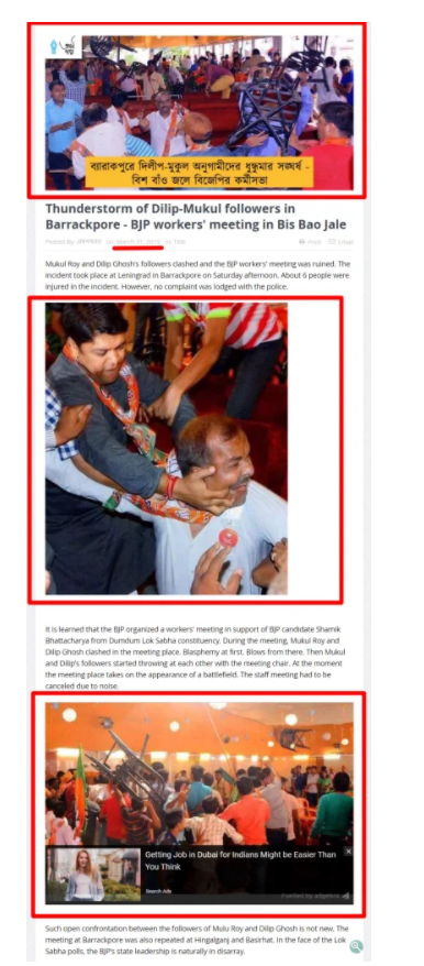 ਇਸ ਤੋਂ ਬਾਅਦ ਅਸੀਂ ਬੰਗਲਾ ਕੀ ਵਰਡ ਦਾ ਇਸਤੇਮਾਲ ਕਰ ਇਨ੍ਹਾਂ ਤਸਵੀਰਾਂ ਦੇ ਬਾਰੇ ਵਿਚ ਹੋਰ ਜਾਣਕਾਰੀ ਪ੍ਰਾਪਤ ਕਰਨ ਦੀ ਕੋਸ਼ਿਸ਼ ਕੀਤੀ ਜਿਸ ਤੋਂ ਬਾਅਦ ਸਾਨੂੰ ekhonkhobor.com ਨਾਮਕ ਇੱਕ ਵੈੱਬਸਾਈਟ ਤੇ ਇਕ ਲੇਖ ਮਿਲਿਆ ਜਿਸ ਨੂੰ ਵੀ 31 ਮਾਰਚ 2019 ਨੂੰ ਅਪਲੋਡ ਕੀਤਾ ਗਿਆ ਸੀ। ਇਸ ਲੇਖ ਦੇ ਮੁਤਾਬਕ ਵੀ ਬੈਰਕਪੁਰ ਵਿਖੇ ਬੀਜੇਪੀ ਦੀ ਇੱਕ ਮੀਟਿੰਗ ਦੌਰਾਨ ਭਾਜਪਾ ਵਰਕਰ ਆਪਸ ਵਿਚ ਭਿੜ ਗਏ ਇਸ ਦੌਰਾਨ ਹੱਥੋਪਾਈ ਦੀ ਘਟਨਾ ਵੀ ਸਾਹਮਣੇ ਆਈ।