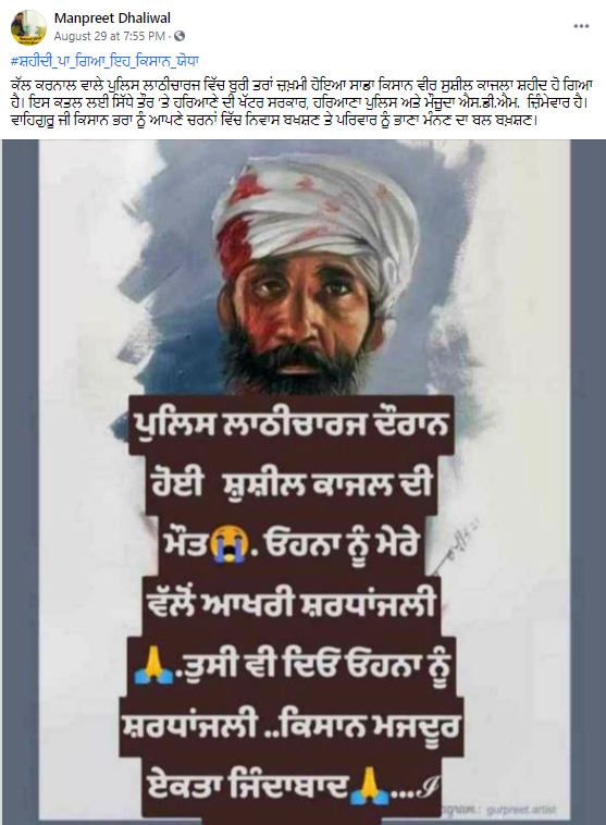 ਇਸ ਦੋਰਾਨ ਸੋਸ਼ਲ ਮੀਡੀਆ ਤੇ ਇਕ ਤਸਵੀਰ ਵਾਇਰਲ ਹੋ ਰਹੀ ਹੈ ਜਿਸ ਵਿੱਚ ਇੱਕ ਕਿਸਾਨ ਨੂੰ ਖੂਨ ਨਾਲ ਲੱਥਪੱਥ ਦੇਖਿਆ ਜਾ ਸਕਦਾ ਹੈ। ਦਾਅਵਾ ਕੀਤਾ ਜਾ ਰਿਹਾ ਹੈ ਕਿ ਇਹ ਸੁਸ਼ੀਲ ਕਾਜਲ ਹਨ ਜਿਨ੍ਹਾਂ ਦੀ ਕਰਨਾਲ ਵਿਖੇ ਪੁਲੀਸ ਲਾਠੀਚਾਰਜ ਦੇ ਦੌਰਾਨ ਮੌਤ ਹੋ ਗਈ।