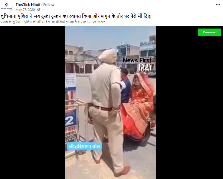 ਸੋਸ਼ਲ ਮੀਡੀਆ ਤੇ ਇਕ ਪੋਸਟ ਵਾਇਰਲ ਹੋ ਰਹੀ ਹੈ ਵਾਇਰਲ ਹੋ ਰਹੀ ਵੀਡੀਓ ਦੇ ਵਿੱਚ ਪੰਜਾਬ ਪੁਲਿਸ (Punjab Police) ਲੌਕਡਾਊਨ ਦੀ ਪਾਲਣਾ ਤੋਂ ਖ਼ੁਸ਼ ਹੋ ਕੇ ਨਵੀਂ ਵਿਆਹੀ ਜੋੜੀ ਨੂੰ ਅਸ਼ੀਰਵਾਦ ਦਿੰਦੇ ਹੋਏ ਦੇਖੇ ਜਾ ਸਕਦੇ ਹਨ।