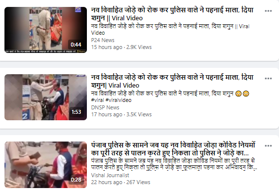 ਸਰਚ ਦੇ ਦੌਰਾਨ ਸਾਨੂੰ ਵਾਇਰਲ ਵੀਡਿਓ ਇਕ ਫੇਸਬੁੱਕ ਯੂਜ਼ਰ ਚੌਧਰੀ ਭੁਪੇਸ਼ ਸ੍ਰੀਵਾਸ ਦੁਆਰਾ ਮਈ 18,2020 ਨੂੰ ਅਪਲੋਡ ਮਿਲੀ। ਚੌਧਰੀ ਭੁਪੇਸ਼ ਸਿਵਾਚ ਨੇ ਇਸ ਵੀਡੀਓ ਨੂੰ ਅਪਲੋਡ ਕਰਦੇ ਹੋਏ ਲਿਖਿਆ,’ ਪੰਜਾਬ ਪੁਲੀਸ ਨੇ ਨਵੀਂ ਵਿਆਹੀ ਜੋੜੀ ਦਾ ਮਾਲਾ ਪਹਿਨਾ ਕੇ ਸਨਮਾਨਿਤ ਕੀਤਾ ਅਤੇ ਸ਼ਗਨ ਦਿੱਤਾ ਕਿਉਂਕਿ ਲਾਕਡਾਊਨ ਦੀ ਪ੍ਰਸਥਿਤੀ ਵਿੱਚ ਬਿਨਾਂ ਭੀੜ, ਬਿਨਾਂ ਬੈਂਡ ਬਾਜਾ ਬਰਾਤ ਦੇ ਇਹ ਜੋੜੀ ਬਹੁਤ ਹੀ ਸਾਦੇ ਤਰੀਕੇ ਨਾਲ ਵਿਆਹ ਕਰਾ ਕੇ ਆਪਣੇ ਘਰ ਜਾ ਰਹੀ ਹੈ।’