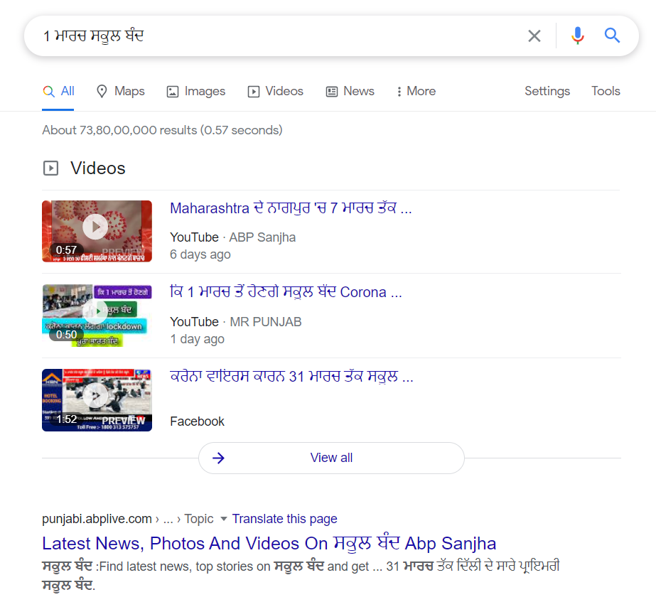 ਹੁਣ ਅਸੀ ਵਾਇਰਲ ਹੋ ਰਹੇ ਦਾਅਵੇ ਨੂੰ ਲੈ ਕੇ ਗੂਗਲ ਤੇ ਕੁਝ ਕੀ ਵਰਡ ਦੀ ਮੱਦਦ ਨਾਲ ਸਰਚ ਕੀਤਾ। ਸਰਚ ਦੇ ਦੌਰਾਨ ਸਾਨੂੰ ਇਸ ਤਰ੍ਹਾਂ ਦੀ ਕੋਈ ਵੀ ਮੀਡੀਆ ਰਿਪੋਰਟ ਨਹੀਂ ਮਿਲੀ ਜਿਸ ਦੇ ਮੁਤਾਬਕ ਪੰਜਾਬ ਸਰਕਾਰ ਨੇ 1 ਮਾਰਚ ਤੋਂ ਸਕੂਲ ਬੰਦ ਕਰਨ ਦਾ ਫ਼ੈਸਲਾ ਲਿਆ ਹੈ। ਗੌਰਤਲਬ ਹੈ ਕਿ ਜੇਕਰ ਪੰਜਾਬ ਸਰਕਾਰ ਨੇ ਇਸ ਤਰ੍ਹਾਂ ਦਾ ਕੋਈ ਫ਼ੈਸਲਾ ਲਿਆ ਹੁੰਦਾ ਤਾਂ ਇਸ ਬਾਰੇ ਵਿਚ ਕੋਈ ਨਾ ਕੋਈ ਮੀਡੀਆ ਰਿਪੋਰਟ ਜ਼ਰੂਰ ਹੁੰਦੀ।