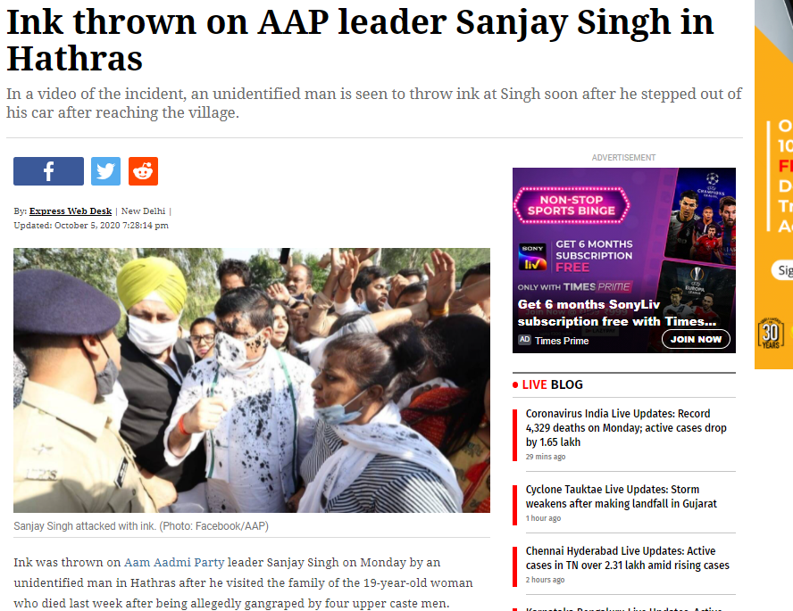 ਸੂਰਜ ਦੇ ਦੌਰਾਨ ਸਾਨੂੰ ਵਾਇਰਲ ਹੋ ਰਹੀ ਤਸਵੀਰ ਨਾਮਵਰ ਮੀਡੀਆ ਏਜੰਸੀ ਇੰਡੀਅਨ ਐਕਸਪ੍ਰੈਸ ਦੁਆਰਾ ਅਕਤੂਬਰ 5,2020 ਨੂੰ ਪ੍ਰਕਾਸ਼ਿਤ ਇੱਕ ਲੇਖ ਦੇ ਵਿਚ ਮਿਲੀ। ਇੰਡੀਅਨ ਐਕਸਪ੍ਰੈੱਸ ਦੁਆਰਾ ਪ੍ਰਕਾਸ਼ਿਤ ਲੇਖ ਤੇ ਮੁਤਾਬਕ ਆਮ ਆਦਮੀ ਪਾਰਟੀ ਦੇ ਲੀਡਰ ਸੰਜੇ ਸਿੰਘ ਤੇ ਹਾਥਰਸ, ਉਤਰ ਪ੍ਰਦੇਸ਼ ਵਿਖੇ ਸਿਆਹੀ ਸੁੱਟੀ ਗਈ।