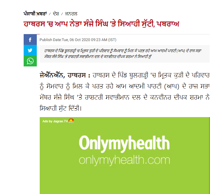 ਇਸ ਮਾਮਲੇ ਨੂੰ ਲੈ ਕੇ ਅਸੀਂ ਪਾਇਆ ਕਿ ਨਾਮਵਰ ਮੀਡੀਆ ਏਜੰਸੀਆਂ ਨੇ ਇਸ ਨੂੰ ਲੈ ਕੇ ਲੇਖ ਪ੍ਰਕਾਸ਼ਤ ਕੀਤੇ ਸਨ। ‘ਪੰਜਾਬੀ ਜਾਗਰਣ’ ਦੀ ਰਿਪੋਰਟ ਦੇ ਮੁਤਾਬਕ ਹਾਥਰਸ ਵਿਖੇ ਪਹੁੰਚੇ ਆਪ ਨੇਤਾ ਤੇ ਰਾਜ ਸਭਾ ਮੈਂਬਰ ਸੰਜੇ ਸਿੰਘ, ਦਿੱਲੀ ਸਰਕਾਰ ਦੇ ਮੰਤਰੀ ਰਾਜਿੰਦਰਪਾਲ ਗੌਤਮ ਵਿਧਾਇਕ ਰਾਖੀ ਬਿੜਲਾ ਤੇ ਪੰਜਾਬ ਦੇ ਵਿਰੋਧੀ ਧਿਰ ਦੇ ਨੇਤਾ ਹਰਪਾਲ ਸਿੰਘ ਚੀਮਾ ਨੂੰ ਪ੍ਰਸ਼ਾਸਨਿਕ ਅਧਿਕਾਰੀ ਆਪਣੇ ਵਾਹਨ ਤੇ ਬੂਲਗੜੀ ਪਿੰਡ ਲੈ ਗਏ ਜਿੱਥੇ ਪੀਡ਼ਤ ਪਰਿਵਾਰ ਨੂੰ ਮਿਲਣ ਦੇ ਮੁੜਦੇ ਸਮੇਂ ਸੰਜੇ ਸਿੰਘ ਬੈਰੀਕੇਡਿੰਗ ਤੇ ਮੀਡੀਆ ਨਾਲ ਗੱਲ ਕਰ ਰਹੇ ਹਨ ਅਤੇ ਉਸ ਵੇਲੇ ਰਾਸ਼ਟਰੀ ਸਵਾਭੀਮਾਨ ਦਲ ਦੀ ਦੀਪਕ ਸ਼ਰਮਾ ਨੇ ਉਨ੍ਹਾਂ ਤੇ ਸਿਆਹੀ ਸੁੱਟ ਦਿੱਤੀ।