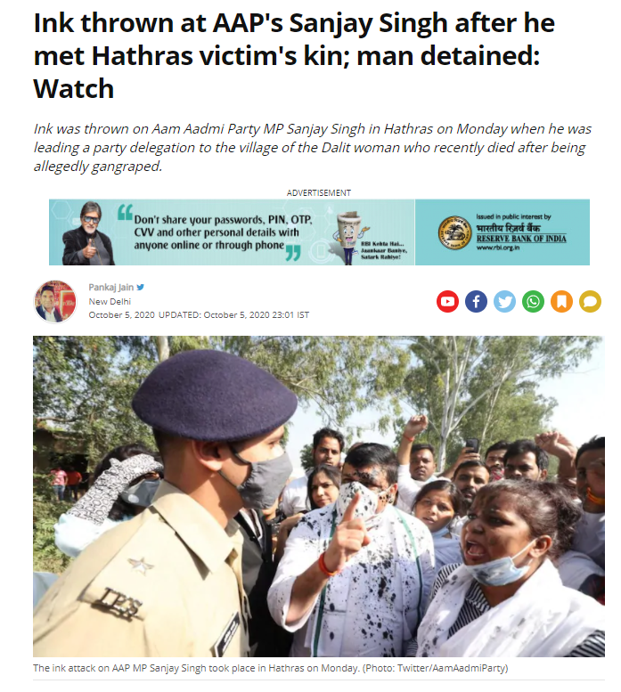 ਇਸ ਲੇਖ ਦੇ ਮੁਤਾਬਕ ਆਮ ਆਦਮੀ ਪਾਰਟੀ ਦੇ ਲੀਡਰ ਸੰਜੇ ਸਿੰਘ ਉੱਤਰ ਪ੍ਰਦੇਸ਼ ਦੇ ਹਾਥਰਸ ਦੇ ਪਿੰਡ ਬੂਲ ਗੜ੍ਹੀ ਵਿਖੇ ਗੈਂਗਰੇਪ ਪੀੜਤਾ ਦੇ ਪਰਿਵਾਰ ਨੂੰ ਮਿਲਣ ਪਹੁੰਚੇ ਸਨ ਜਿੱਥੇ ਰਾਸ਼ਟਰੀ ਸਵਾਭੀਮਾਨ ਦਲ ਦੇ ਕਨਵੀਨਰ ਦੀਪਕ ਸ਼ਰਮਾ ਨੇ ਸੰਜੇ ਸਿੰਘ ਤੇ ਸਿਆਹੀ ਸੁੱਟ ਦਿੱਤੀ।