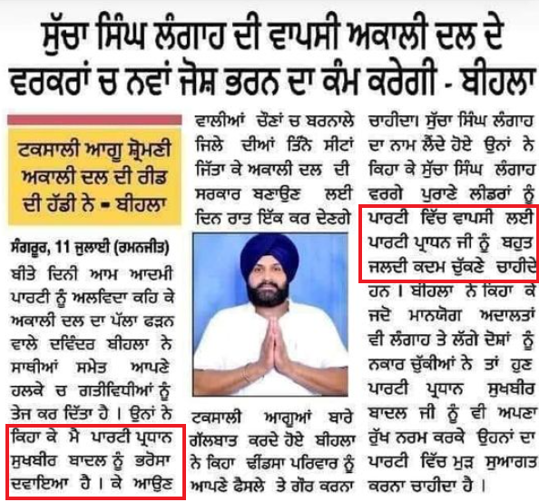 ਸੋਸ਼ਲ ਮੀਡੀਆ ਤੇ ਇਕ ਪੋਸਟ ਵਾਇਰਲ ਹੋ ਰਹੀ ਹੈ ਜਿਸ ਵਿੱਚ ਦਾਅਵਾ ਕੀਤਾ ਜਾ ਰਿਹਾ ਹੈ ਕਿ ਬਰਨਾਲਾ ਤੋਂ ਸ਼੍ਰੋਮਣੀ ਅਕਾਲੀ ਦਲ (Shiromani Akali Dal) ਦੇ ਲੀਡਰ ਦਵਿੰਦਰ ਸਿੰਘ ਬੀਹਲਾ ਨੇ ਬਿਆਨ ਦਿੰਦਿਆਂ ਕਿਹਾ ਹੈ ਕਿ ਸੁੱਚਾ ਸਿੰਘ ਲੰਗਾਹ ਦੀ ਵਾਪਸੀ ਸ਼੍ਰੋਮਣੀ ਅਕਾਲੀ ਦਲ ਦੇ ਵਰਕਰਾਂ ਚ ਨਵਾਂ ਜੋਸ਼ ਭਰਨ ਦਾ ਦਾ ਕੰਮ ਕਰੇਗੀ। ਗੌਰਤਲਬ ਹੈ ਕਿ ਦਵਿੰਦਰ ਸਿੰਘ ਸਿੱਧੂ ਬੀਹਲਾ ਪਿਛਲੇ ਸਾਲ ਪੰਜਾਬ ਏਕਤਾ ਪਾਰਟੀ ਨੂੰ ਅਲਵਿਦਾ ਆਖ ਸ਼੍ਰੋਮਣੀ ਅਕਾਲੀ ਦਲ ਦੇ ਵਿੱਚ ਸ਼ਾਮਿਲ ਹੋਏ ਗਏ ਸਨ। ਇਸ ਤੋਂ ਪਹਿਲਾਂ ਉਹ ਆਮ ਆਦਮੀ ਪਾਰਟੀ ਦੇ ਕਦਾਵਰ ਨੇਤਾਵਾਂ ਵਿੱਚੋਂ ਇੱਕ ਸਨ।