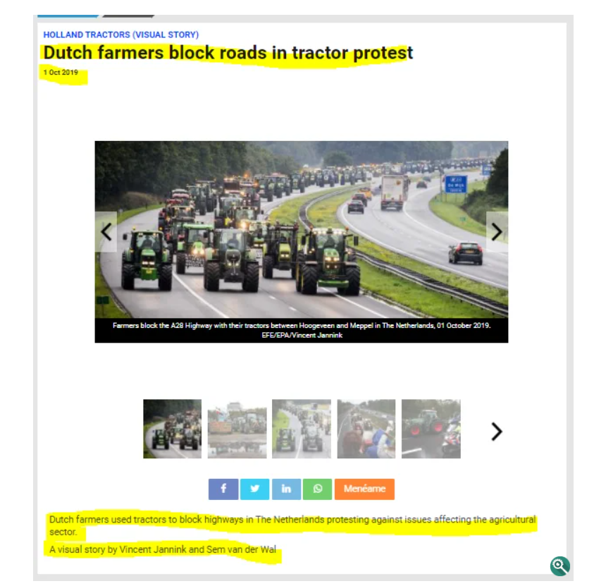 ਗੂਗਲ ਰਿਵਰਸ ਇਮੇਜ ਸਰਚ ਦੀ ਮਦਦ ਨਾਲ ਖੰਗਾਲਣ ਤੇ ਸਾਨੂੰ ਅਕਤੂਬਰ 1,2019 ਨੂੰ Grain.org ਅਤੇ efe.com ਦੁਆਰਾ ਪ੍ਰਕਾਸ਼ਿਤ ਰਿਪੋਰਟ ਮਿਲੀਆਂ। ਇਨ੍ਹਾਂ ਰਿਪੋਰਟਾਂ ਦੇ ਮੁਤਾਬਿਕ ਇਹ ਤਸਵੀਰ ਨੀਦਰਲੈਂਡ ਵਿੱਚ ਕੀਤੇ ਗਏ ਕਿਸਾਨਾਂ ਦੇ ਵਿਰੋਧ ਪ੍ਰਦਰਸ਼ਨ ਦੀ ਹੈ।
