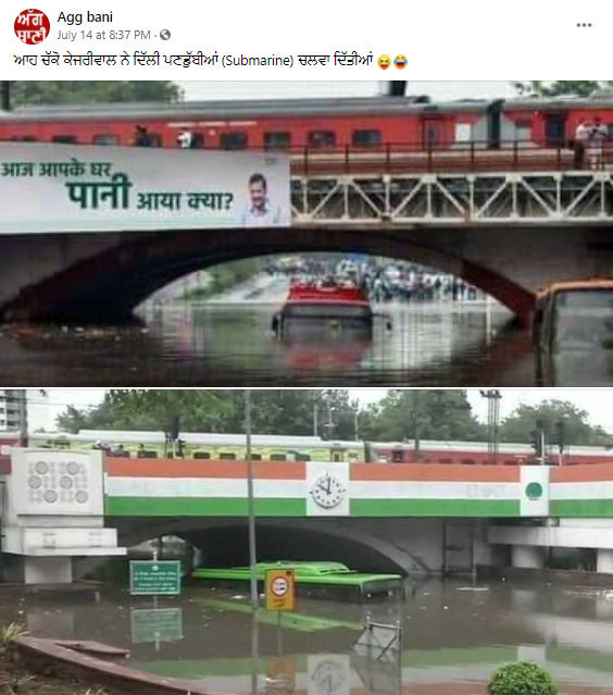 ਫੇਸਬੁੱਕ ਪੇਜ AggBani ਨੇ ਵਾਇਰਲ ਤਸਵੀਰਾਂ ਸ਼ੇਅਰ ਕਰਦਿਆਂ ਲਿਖਿਆ, “ਆਹ ਚੱਕੋ ਕੇਜਰੀਵਾਲ ਨੇ ਦਿੱਲੀ ਵਿੱਚ ਪਣਡੁੱਬੀਆਂ (Submarine) ਚਲਵਾ ਦਿੱਤੀਆਂ”