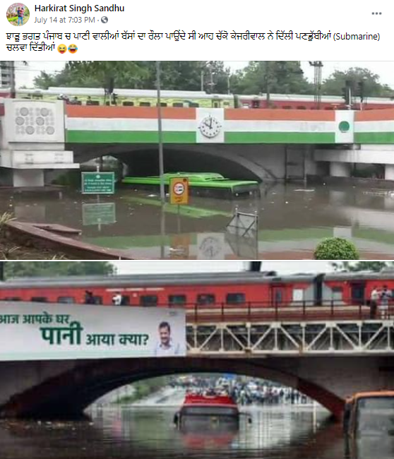 ਸੋਸ਼ਲ ਮੀਡਿਆ ਤੇ ਦੋ ਤਸਵੀਰਾਂ ਵਾਇਰਲ ਹੋ ਰਹੀਆਂ ਹਨ। ਵਾਇਰਲ ਤਸਵੀਰਾਂ ਵਿਚ ਦਿੱਲੀ (Delhi) ਦੇ ਮਿੰਟੋ ਬ੍ਰਿਜ ਹੇਠਾਂ ਬਸਾਂ ਨੂੰ ਪਾਣੀ ‘ਚ ਡੁੱਬਿਆ ਵੇਖਿਆ ਜਾ ਸਕਦਾ ਹੈ। ਦਾਅਵਾ ਕੀਤਾ ਜਾ ਰਿਹਾ ਹੈ ਕਿ ਮੌਨਸੂਨ ਦੀ ਪਹਿਲੀ ਬਾਰਿਸ਼ ਕਰਕੇ ਇਹ ਹਾਲ ਦਿੱਲੀ ‘ਚ ਵੇਖਣ ਨੂੰ ਮਿਲਿਆ ਹੈ। ਸੋਸ਼ਲ ਮੀਡਿਆ ਤੇ ਵਾਇਰਲ ਹੋ ਰਹੀ ਤਸਵੀਰਾਂ ਦਾ ਇਸਤੇਮਾਲ ਕਰ ਕੇਜਰੀਵਾਲ ਸਰਕਾਰ ‘ਤੇ ਤੰਜ ਕੱਸਿਆ ਜਾ ਰਿਹਾ ਹੈ।