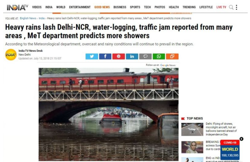 ਅਸੀਂ ਵਾਇਰਲ ਹੋ ਰਹੀ ਪਹਿਲੀ ਤਸਵੀਰ ਨੂੰ ਸਰਚ ਕਰਨਾ ਸ਼ੁਰੂ ਕੀਤਾ। ਵਾਇਰਲ ਹੋ ਰਹੀ ਪਹਿਲੀ ਤਸਵੀਰ ਵਿਚ ਲਾਲ ਰੰਗ ਦੀ ਬਸ ਨੂੰ ਪਾਣੀ ‘ਚ ਵੇਖਿਆ ਜਾ ਸਕਦਾ ਹੈ। ਗੂਗਲ ਰਿਵਰਸ ਇਮੇਜ ਦੀ ਮਦਦ ਨਾਲ ਖੰਗਾਲਣ ਤੇ ਸਾਨੂੰ ਵਾਇਰਲ ਤਸਵੀਰ India TV ਦੁਆਰਾ 13 ਜੁਲਾਈ 2018 ਨੂੰ ਪ੍ਰਕਾਸ਼ਿਤ ਖਬਰ ਵਿਚ ਅਪਲੋਡ ਮਿਲੀ। ਖਬਰ ਨੂੰ ਪ੍ਰਕਾਸ਼ਿਤ ਕਰਦੇ ਹੋਏ ਸਿਰਲੇਖ ਦਿੱਤਾ ਗਿਆ, “Heavy rains lash Delhi-NCR, water-logging, traffic jam reported from many areas , MeT department predicts more showers”