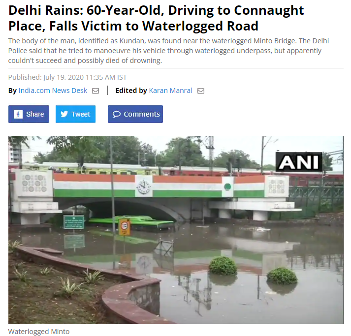 ਅਸੀਂ ਵਾਇਰਲ ਹੋ ਰਹੀ ਪਹਿਲੀ ਤਸਵੀਰ ਨੂੰ ਸਰਚ ਕਰਨਾ ਸ਼ੁਰੂ ਕੀਤਾ। ਵਾਇਰਲ ਹੋ ਰਹੀ ਦੂਜੀ ਤਸਵੀਰ ਵਿਚ ਹਰੇ ਰੰਗ ਦੀ ਬਸ ਨੂੰ ਪਾਣੀ ‘ਚ ਵੇਖਿਆ ਜਾ ਸਕਦਾ ਹੈ। ਗੂਗਲ ਰਿਵਰਸ ਇਮੇਜ ਦੀ ਮਦਦ ਨਾਲ ਖੰਗਾਲਣ ਤੇ ਸਾਨੂੰ ਇਹ ਤਸਵੀਰ India.com ਦੁਆਰਾ 19 ਜੁਲਾਈ 2020 ਨੂੰ ਪ੍ਰਕਾਸ਼ਿਤ ਖਬਰ ਵਿਚ ਅਪਲੋਡ ਮਿਲੀ। ਖਬਰ ਨੂੰ ਪ੍ਰਕਾਸ਼ਿਤ ਕਰਦੇ ਹੋਏ ਸਿਰਲੇਖ ਦਿੱਤਾ ਗਿਆ, “Delhi Rains: 60-Year-Old, Driving to Connaught Place, Falls Victim to Waterlogged Road”