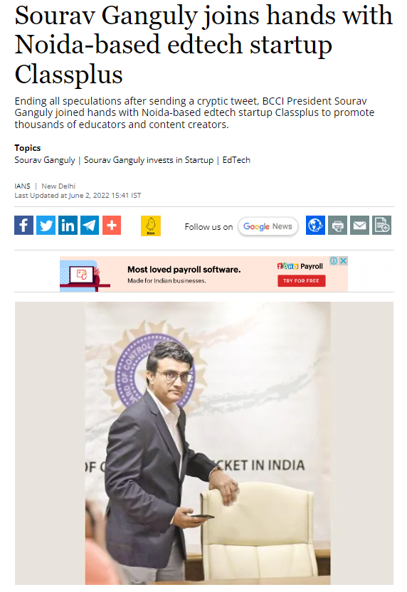 ਸਰਚ ਦੇ ਦੌਰਾਨ ਸਾਨੂੰ ਬਿਜ਼ਨਸ ਸਟੈਂਡਰਡ ਦੁਆਰਾ ਪ੍ਰਕਾਸ਼ਿਤ ਇੱਕ ਰਿਪੋਰਟ ਮਿਲੀ। ਰਿਪੋਰਟ ਦੇ ਮੁਤਾਬਕ ਸੌਰਵ ਗਾਂਗੁਲੀ ਨੇ ਨੋਇਡਾ ਆਧਾਰਿਤ ਸਟਾਰਟਅੱਪ ਕਲਾਸਪਲੱਸ ਦੇ ਨਾਲ ਕਰਾਰ ਕੀਤਾ ਹੈ। ਰਿਪੋਰਟ ਦੇ ਮੁਤਾਬਕ ਸੌਰਵ ਗਾਂਗੁਲੀ ਦੇ ਟਵੀਟ ਤੋਂ ਬਾਅਦ ਅਟਕਲਾਂ ਸ਼ੁਰੂ ਹੋ ਗਈਆਂ ਕਿ ਸੌਰਵ ਗਾਂਗੁਲੀ ਨੇ ਬੀਸੀਸੀਆਈ ਪ੍ਰਧਾਨ ਦੇ ਅਹੁਦੇ ਤੋਂ ਅਸਤੀਫ਼ਾ ਦੇ ਦਿੱਤਾ ਹੈ ਪਰ ਸੌਰਵ ਗਾਂਗੁਲੀ ਨੇ ਸਪਸ਼ਟ ਕੀਤਾ ਕਿ ਉਨ੍ਹਾਂ ਨੇ ਅਸਤੀਫ਼ਾ ਨਹੀਂ ਦਿੱਤਾ ਹੈ।
