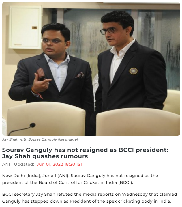 ਆਪਣੀ ਸਰਚ ਦੇ ਦੌਰਾਨ ਸਾਨੂੰ ANI ਦੁਆਰਾ ਪ੍ਰਕਾਸ਼ਿਤ ਇਕ ਆਰਟੀਕਲ ਮਿਲਿਆ। ANI ਨੇ ਬੀਸੀਸੀਆਈ ਸਕੱਤਰ ਜੈ ਸ਼ਾਹ ਦੇ ਹਵਾਲੇ ਤੋਂ ਸੌਰਵ ਗਾਂਗੁਲੀ ਨੇ ਬੀਸੀਸੀਆਈ ਪ੍ਰਧਾਨ ਦੇ ਅਹੁਦੇ ਤੋਂ ਅਸਤੀਫ਼ਾ ਦੇਣ ਦੀ ਖ਼ਬਰਾਂ ਨੂੰ ਫ਼ਰਜ਼ੀ ਦੱਸਿਆ।