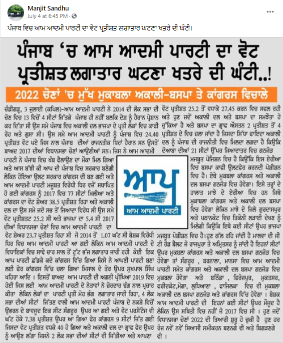 ਫੇਸਬੁੱਕ ਯੂਜ਼ਰ “ਮਨਜੀਤ ਸੰਧੂ” ਨੇ ਵਾਇਰਲ ਕਟਿੰਗ ਨੂੰ ਅਪਲੋਡ ਕਰਦਿਆਂ ਲਿਖਿਆ, “ਪੰਜਾਬ ਵਿਚ ਆਮ ਆਦਮੀ ਪਾਰਟੀ ਦਾ ਵੋਟ ਪ੍ਰਤੀਸ਼ਤ ਲਗਾਤਾਰ ਘਟਣਾ ਖਤਰੇ ਦੀ ਘੰਟੀ।” ਮਨਜੀਤ ਸੰਧੂ ਦੀ ਪ੍ਰੋਫਾਈਲ ਖੰਗਾਲਣ ਤੇ ਅਸੀਂ ਪਾਇਆ ਕਿ ਮਨਜੀਤ ਸੰਧੂ ਸ਼੍ਰੋਮਣੀ ਅਕਾਲੀ ਦਲ ਦੇ ਸਮਰਥਕ ਹਨ।